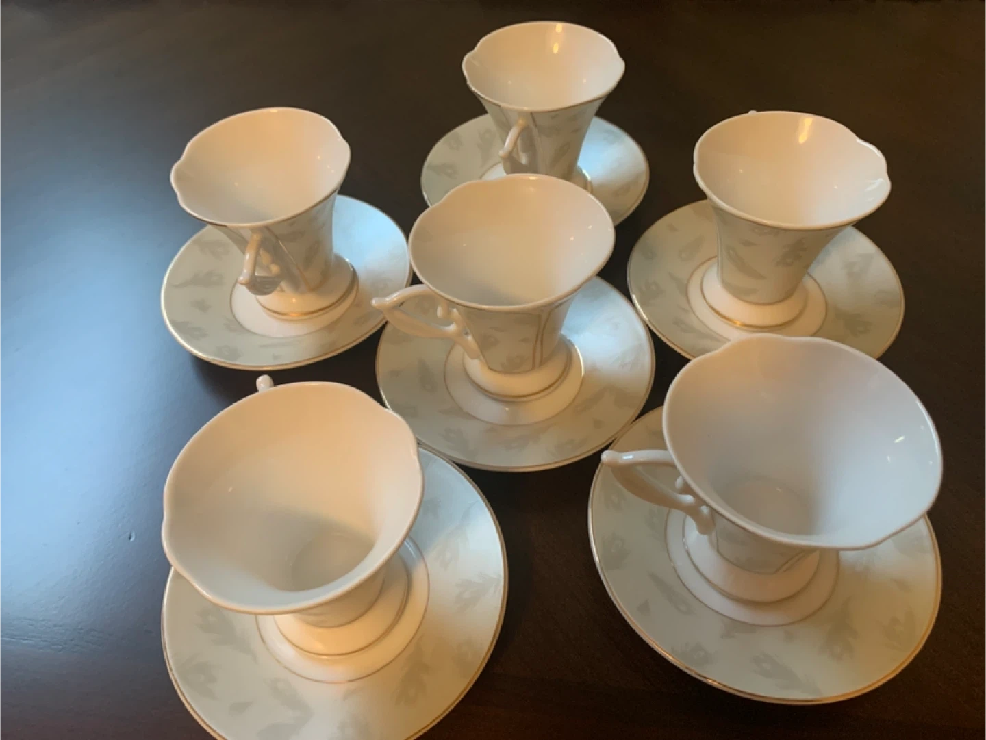 Selling a lovely set of vintage tea cups. They have a delicate floral pattern and gold trim, perfect for adding a touch of elegance to your tea time No original box