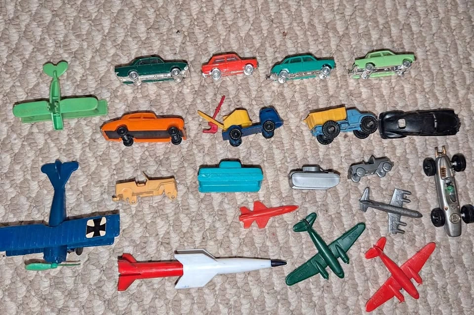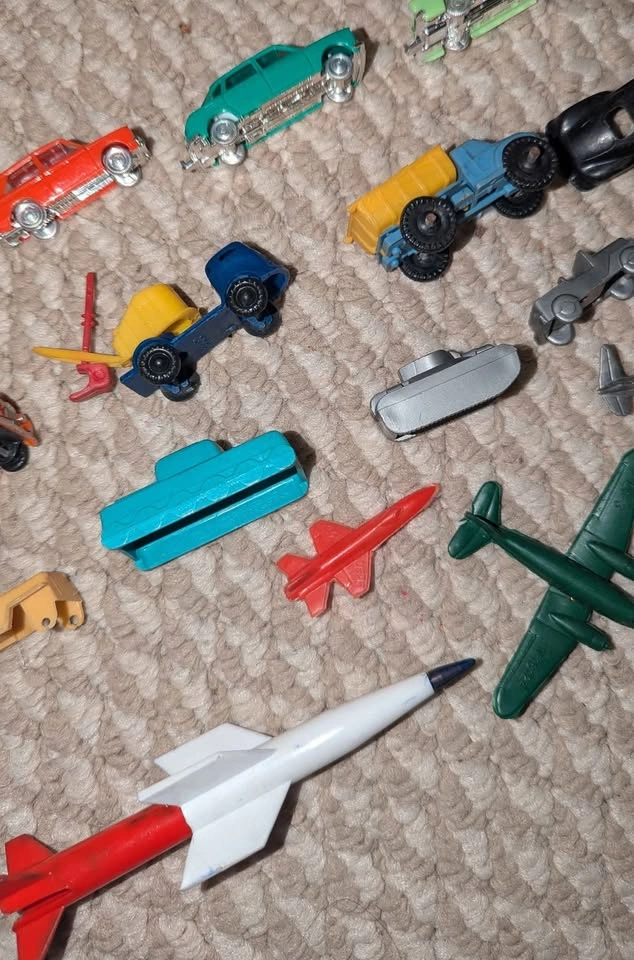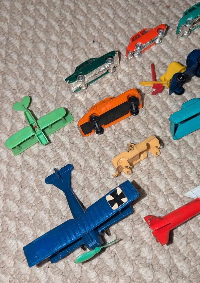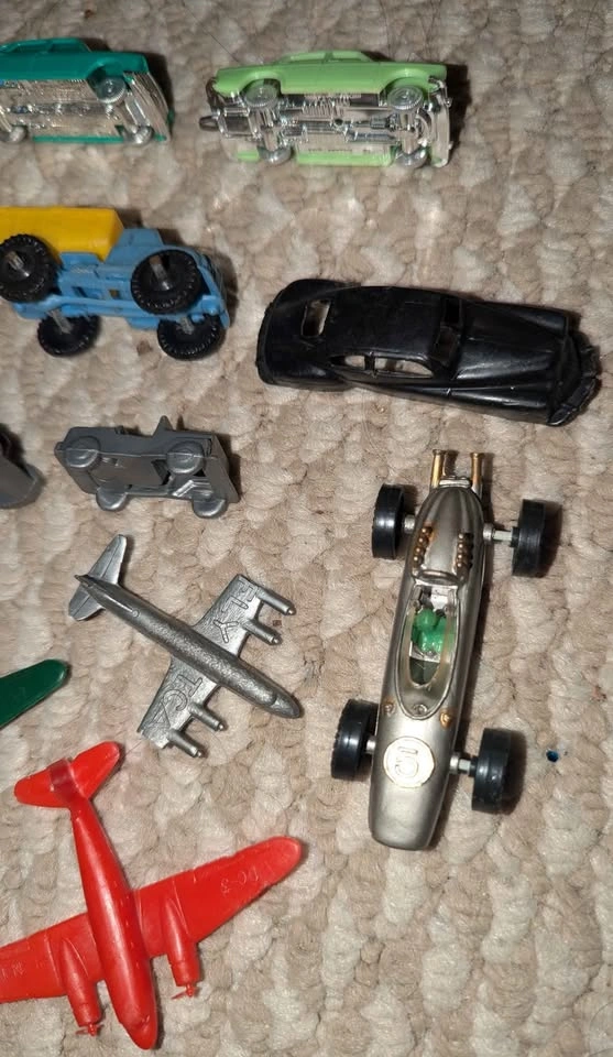 Fun mixed lot of 20 vintage toy vehicles, great for collectors, display, or restoration projects. Includes: Colorful plastic airplanes & rocket (1950sβ70s style) Assorted vintage die-cast cars & trucks (Matchbox-style) Formula-style race car, dump trucks, biplanes, submarine & more (Sold all, as is, not individually)