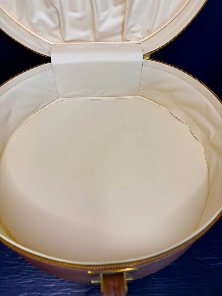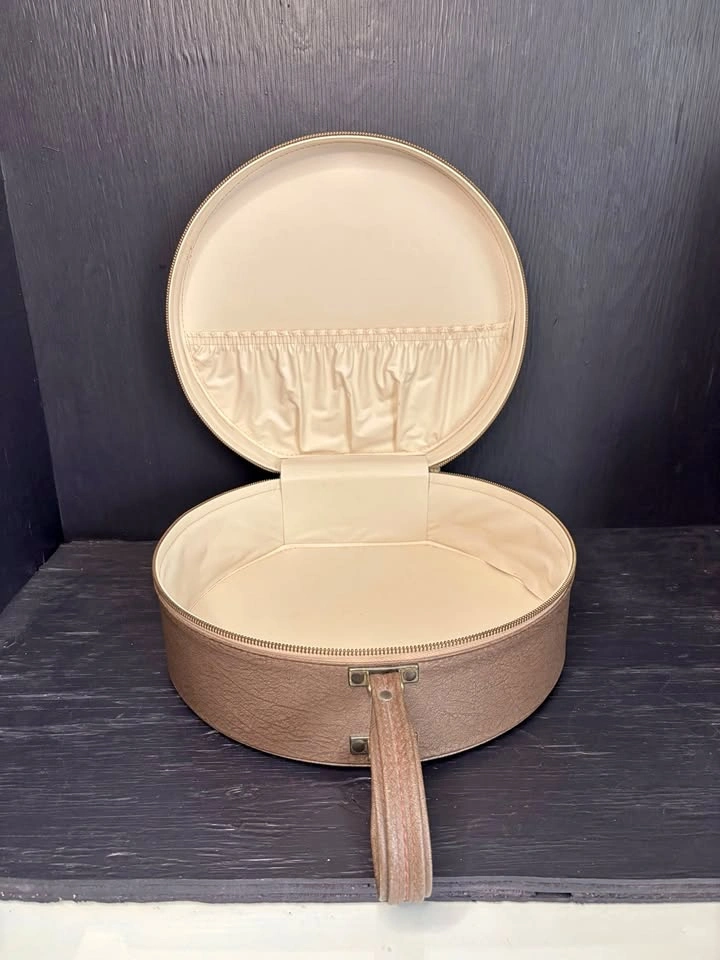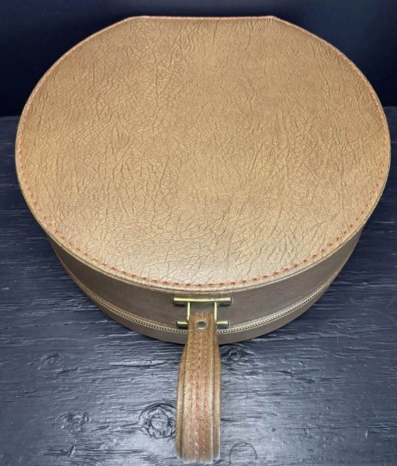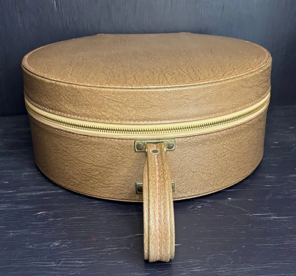Picture yourself in the 1950's, travelling to your next destination adventure on a train that is resplendent with the sights and sounds of a simpler time. Light music coming from the entertainment car wafts through your cabin. Since the party is starting, it is time for you to get ready. You reach for your outfit for the night and this stunning Vintage Train Travel Makeup Wig Case and start to get ready for a memorable time. This charming retro travel bag is perfect for storing wigs, cosmetics, or travel essentials as you take your next journey. You can be on a day trip, a weekend away or a much needed vacation. this elegant case will be there with you every step of the way. This round travel case features a secure zipper closure and ample space to store clothing, makeup, wigs, or daily essentials, making it ideal for stylists and makeup artists that are on the go, collectors, or vintage enthusiasts. Add this to your travel luggage or wardrobe accessories and provide yourself with a stylish accessory to old-world glamour. This Vintage Train Travel Makeup Wig Case measures approximately 13 inches or 34cm in diameter and 3.5 inches or 9cm deep and is in excellent condition.