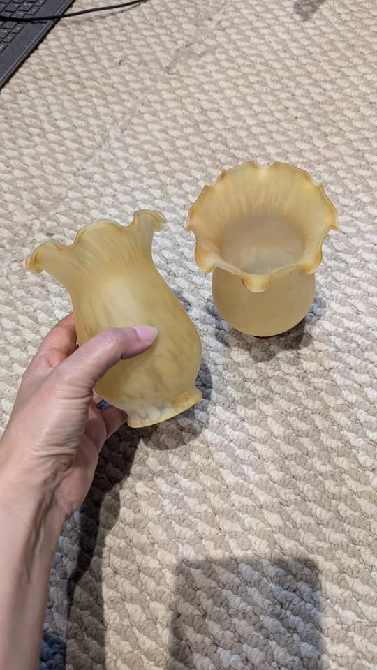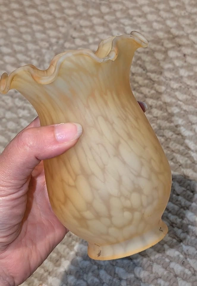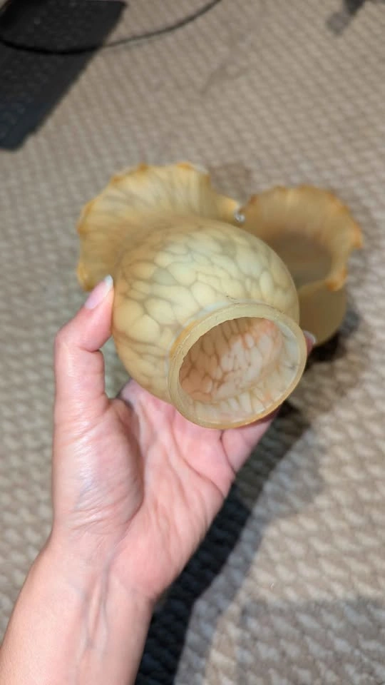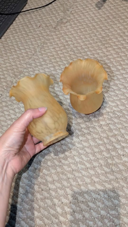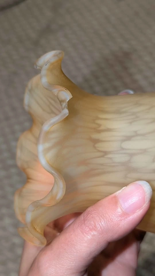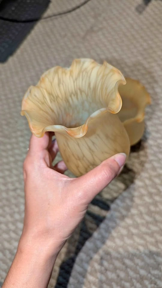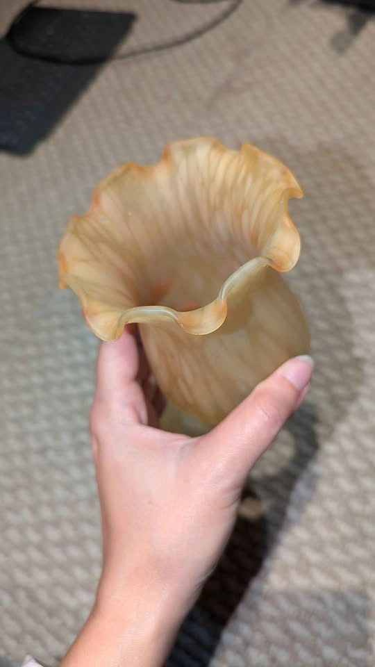 Price for the pair 2 inch opening, 5 inch length Very good vintage condition! Small chip in the ruffle edge on one, because of the placement in the curvature, it's barely noticeable (I didn't even realize it at first glance) Frosted amber swirl, ruffled tulip top, delicate flare, very pretty art deco era vintage!
