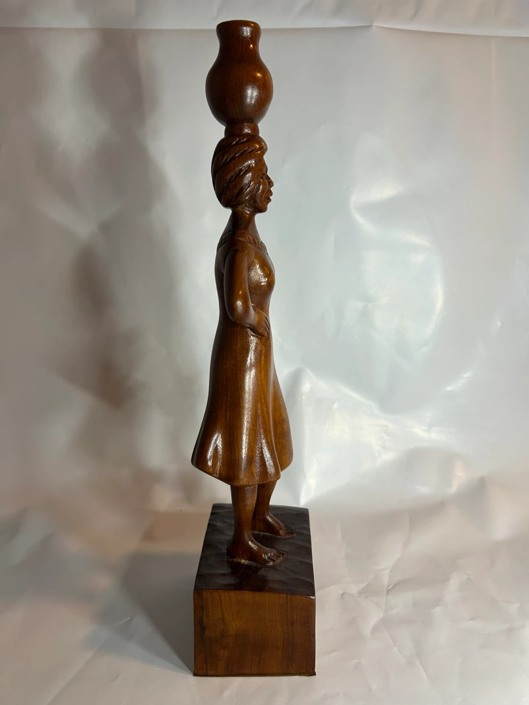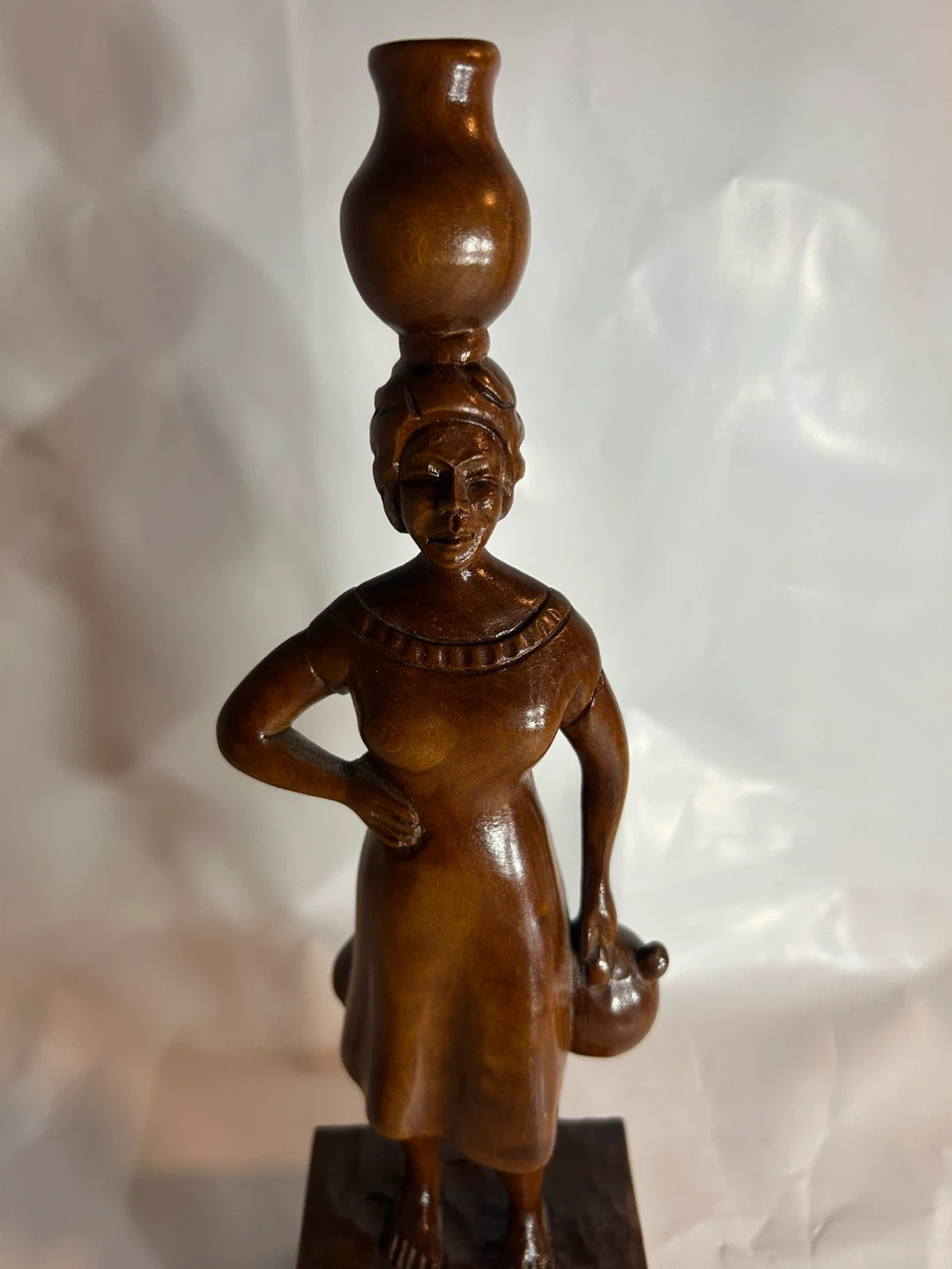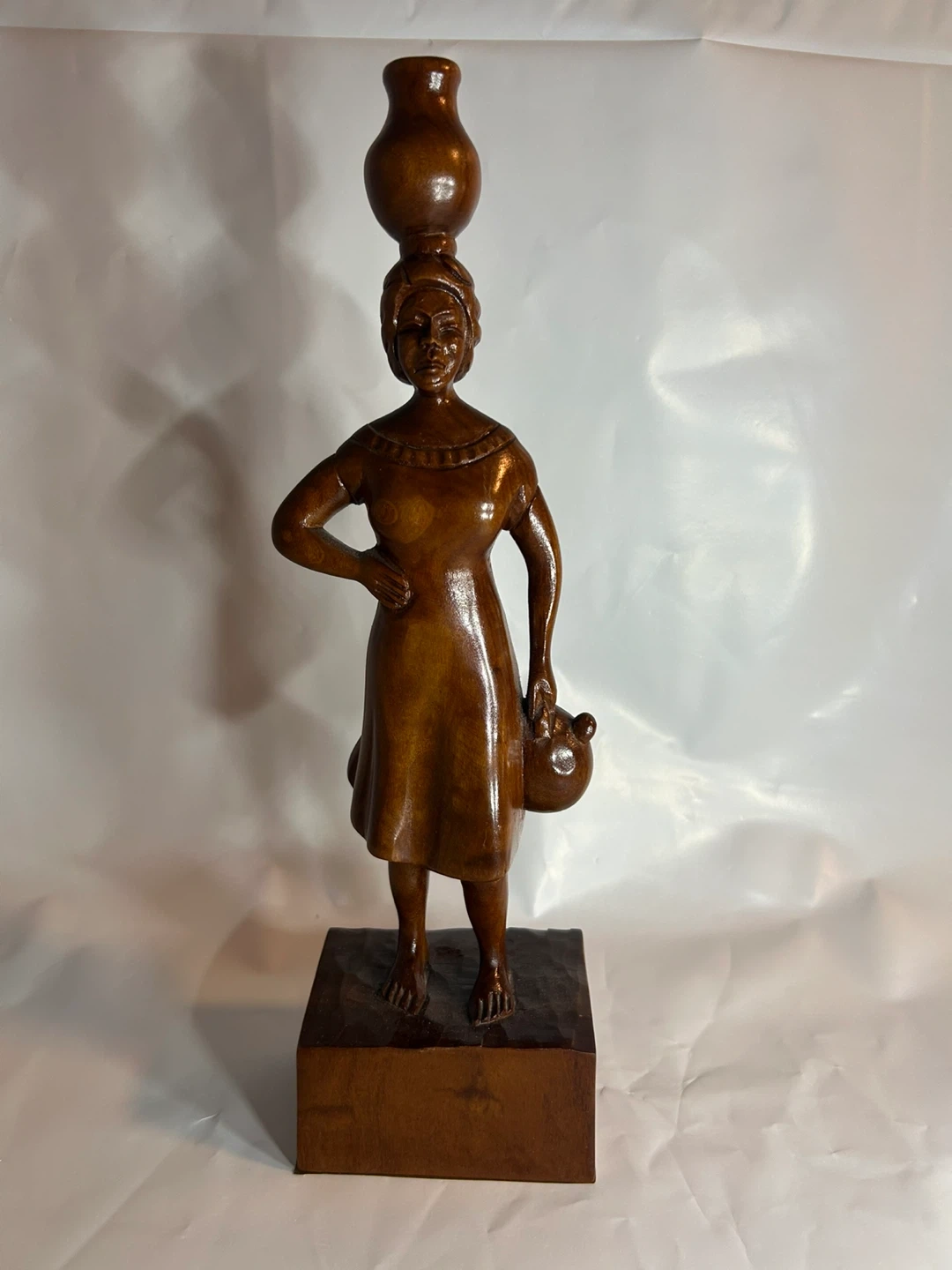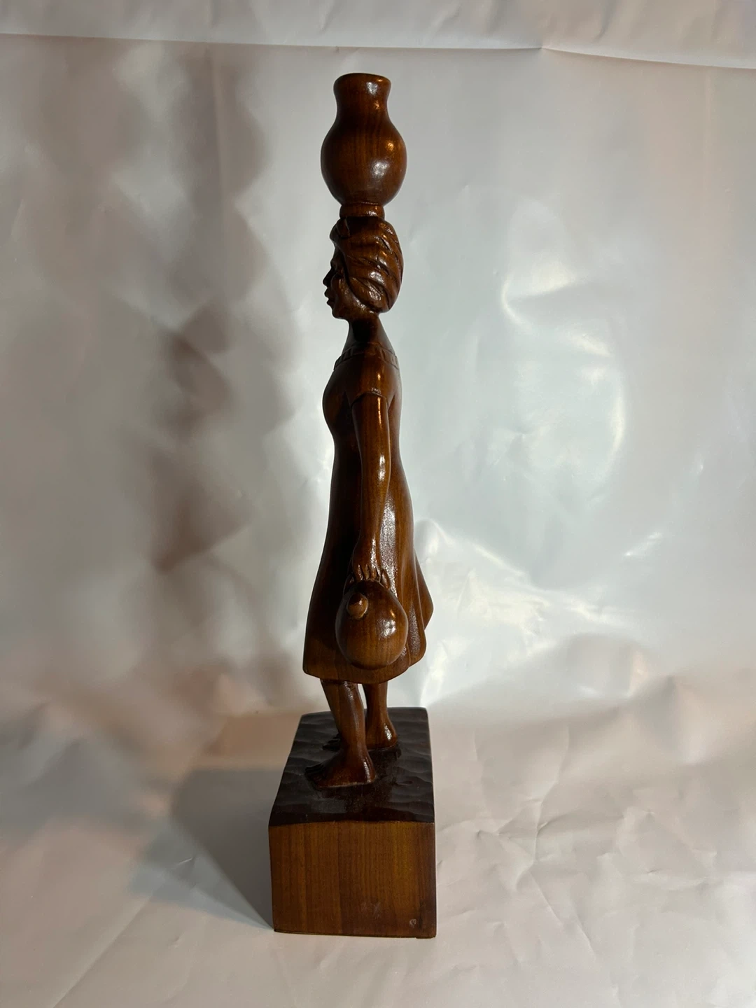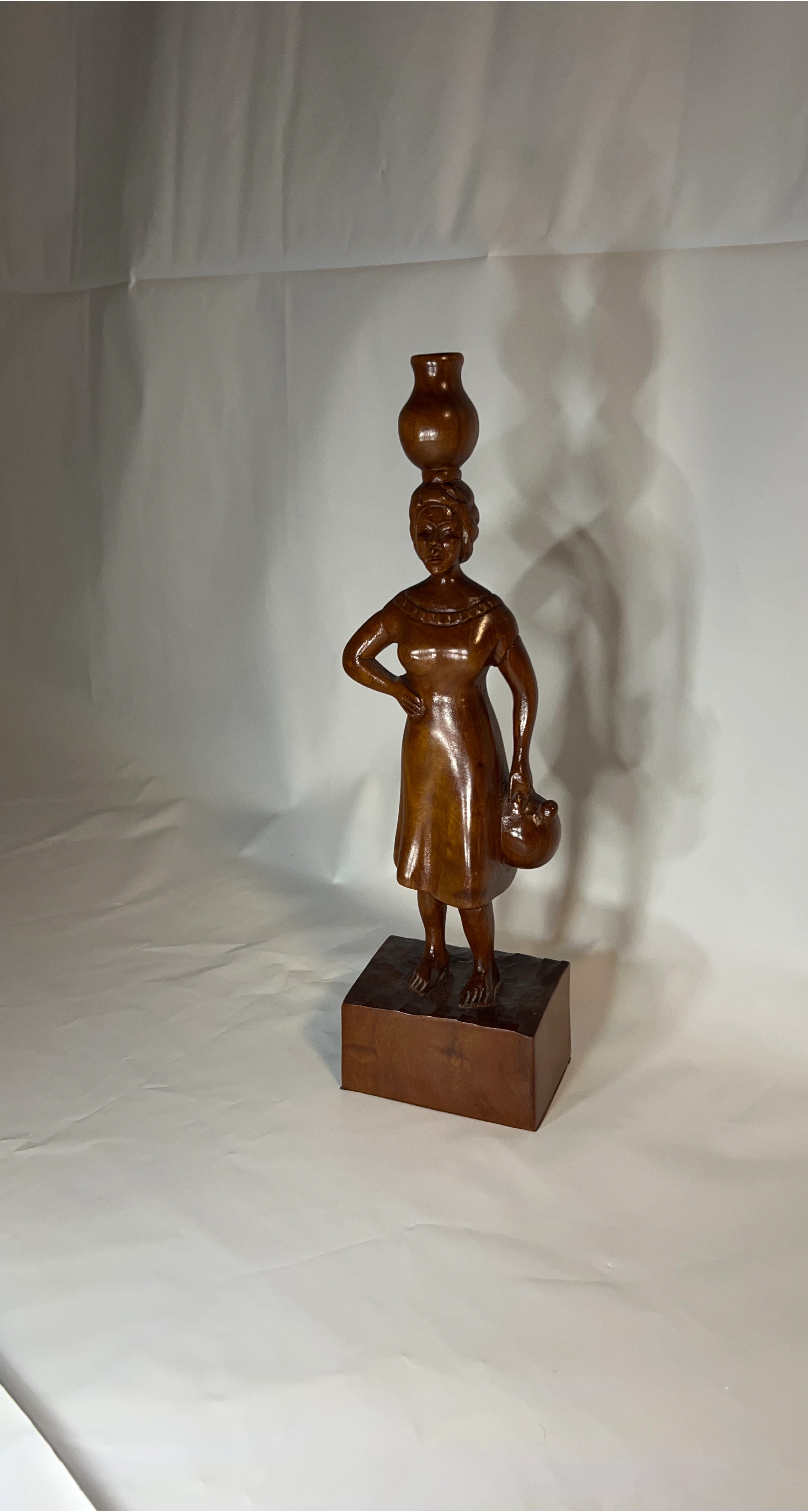 Beautiful vintage wood carving of an African woman carrying a pot on her head and holding a smaller pot. A lovely piece of art for your home!
