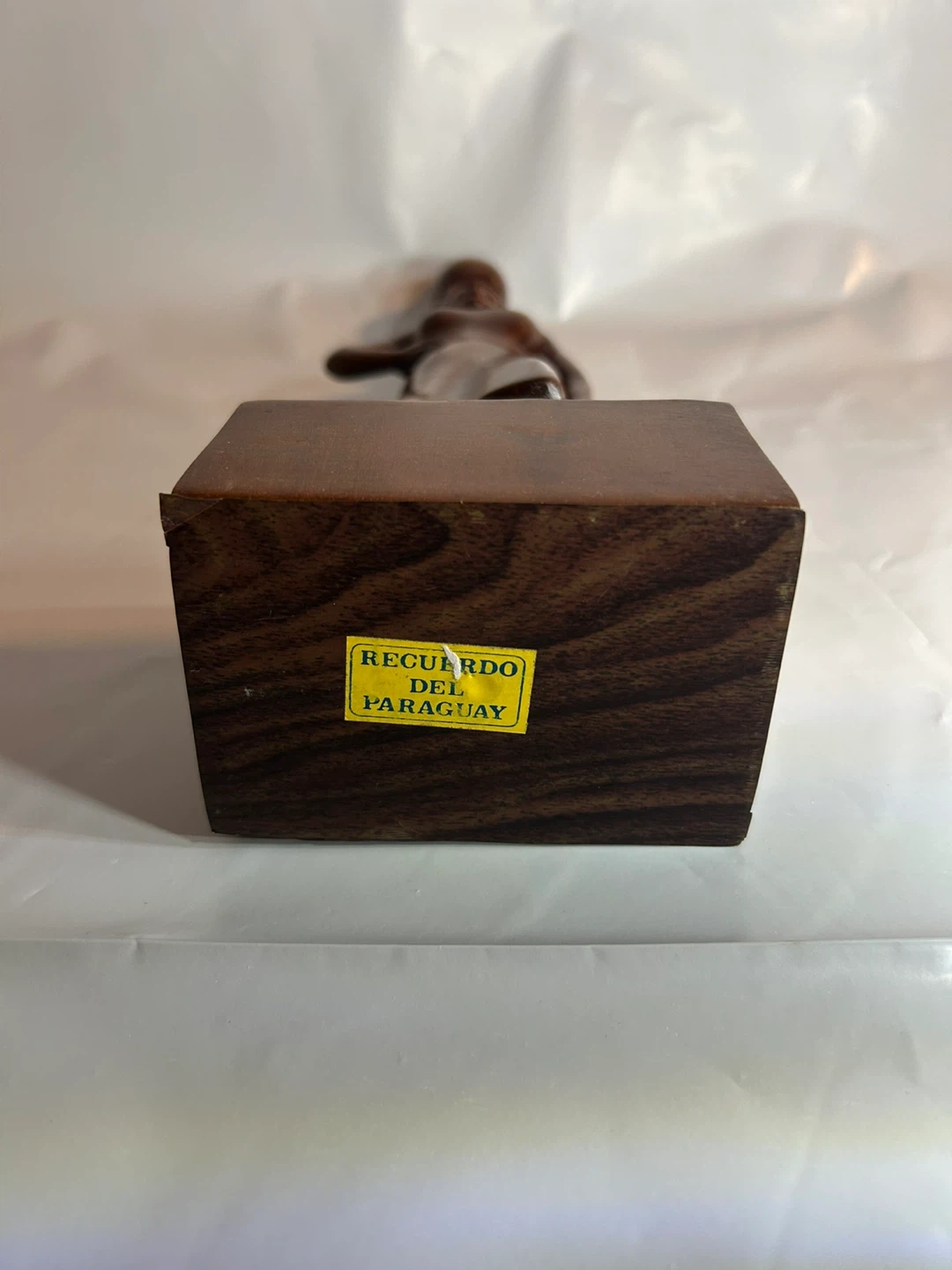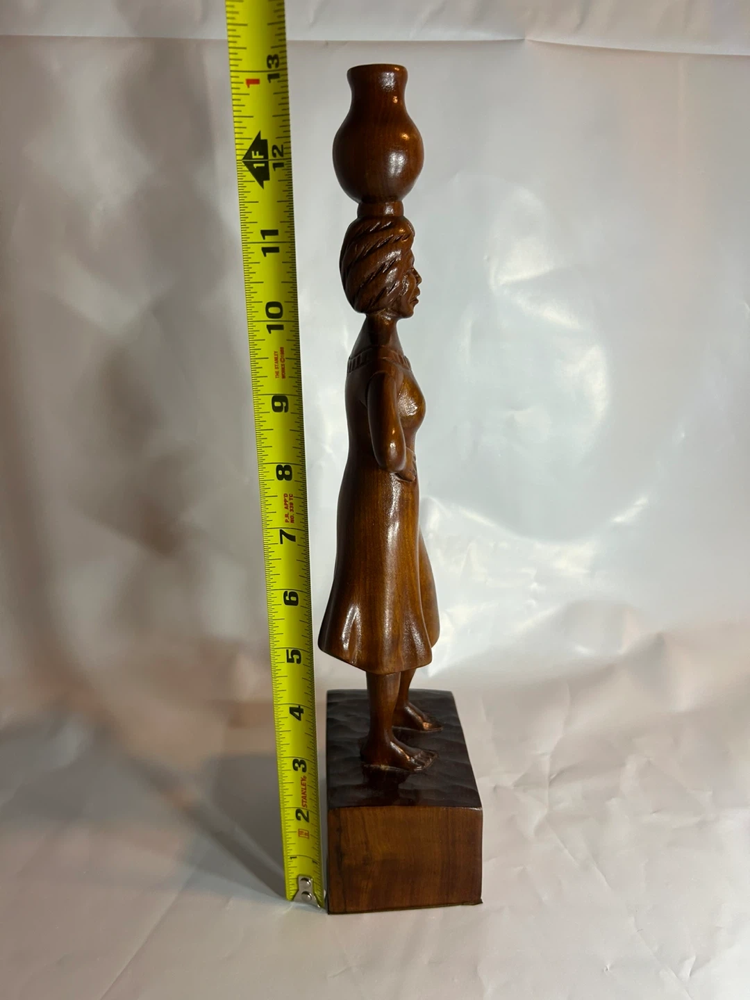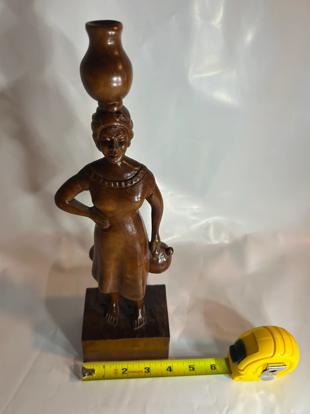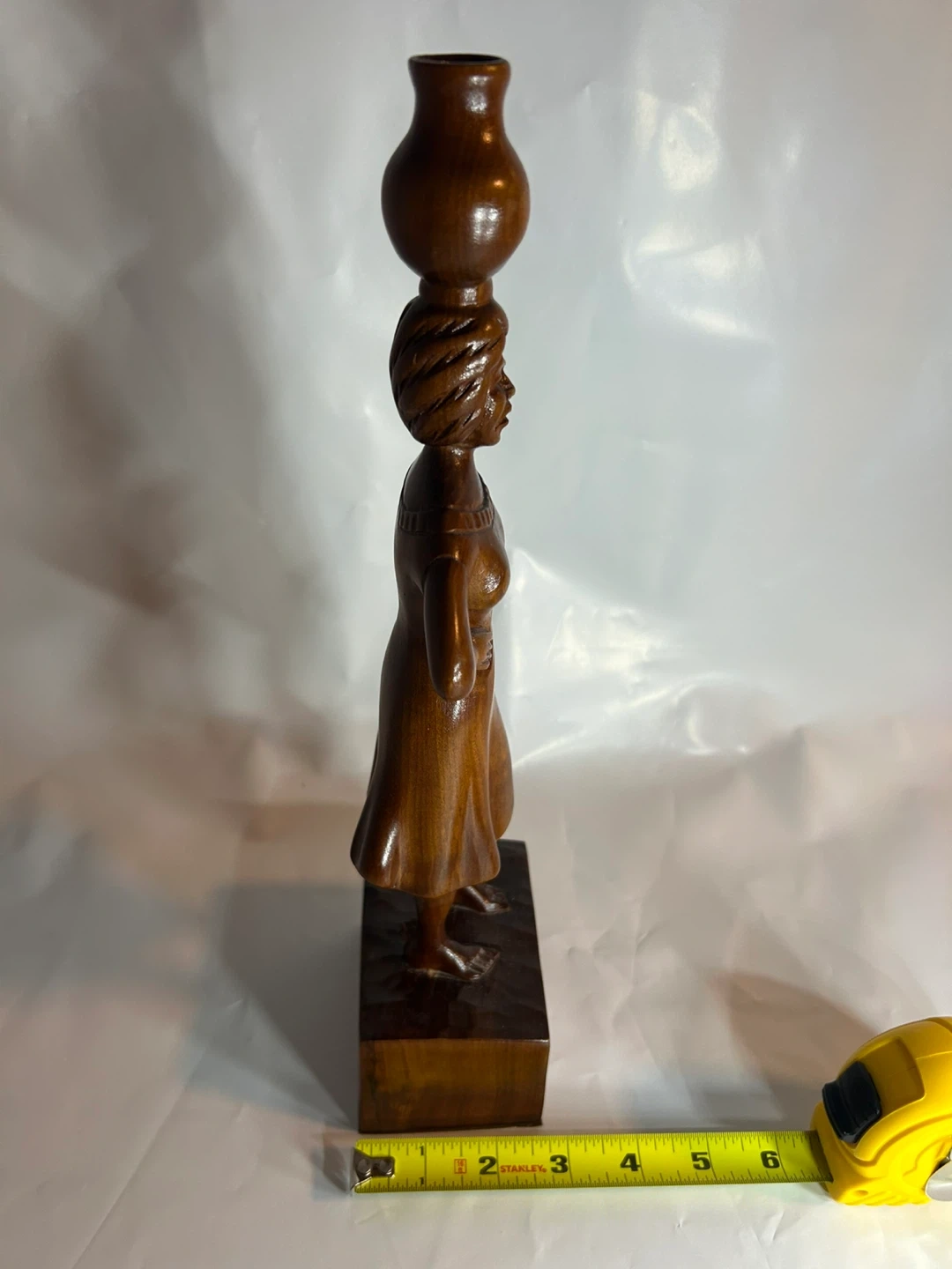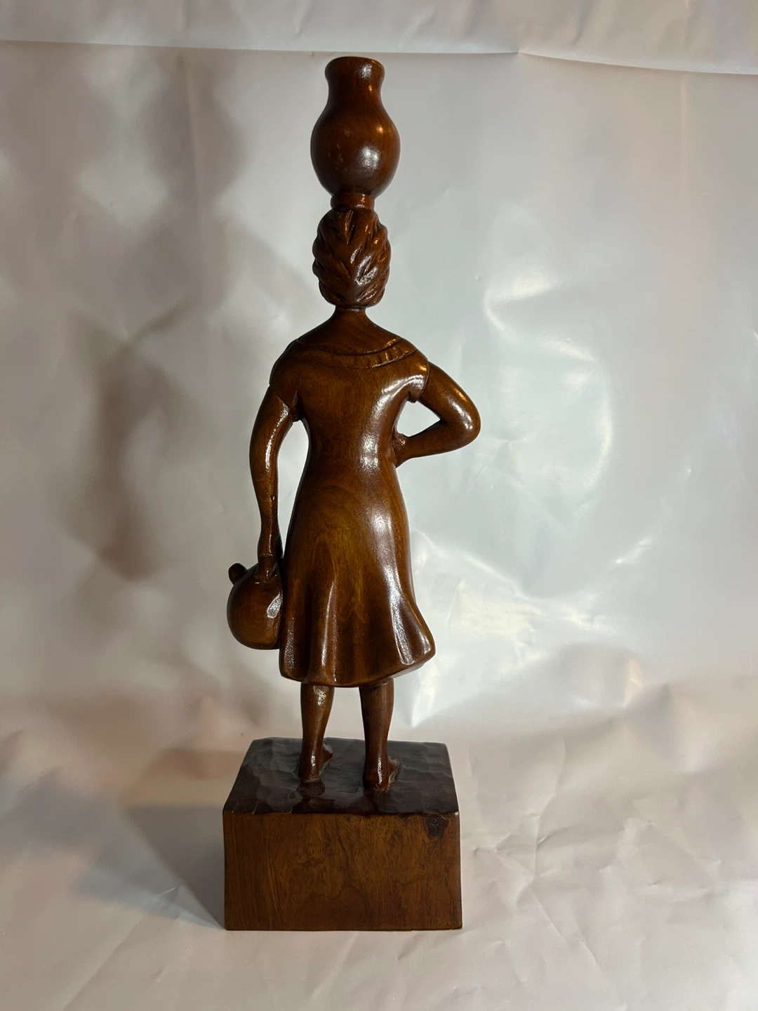 Beautiful vintage wood carving of an African woman carrying a pot on her head and holding a smaller pot. A lovely piece of art for your home!