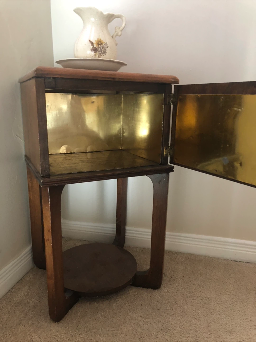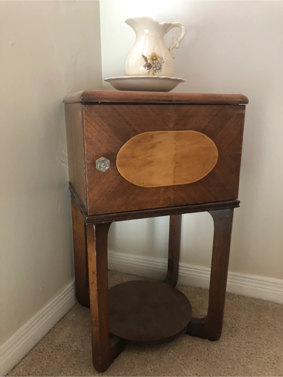 Selling a lovely vintage wooden side table. It features a unique design with a storage compartment inside. The table has a warm, classic look that would complement any room. Perfect for adding a touch of vintage charm to your home!