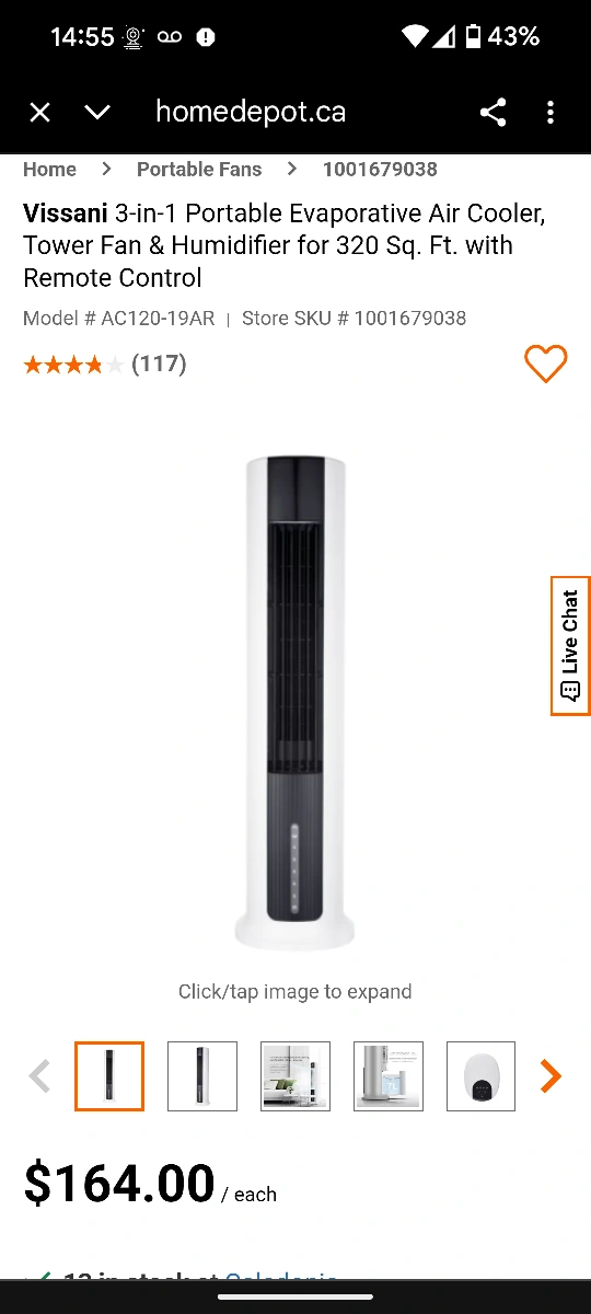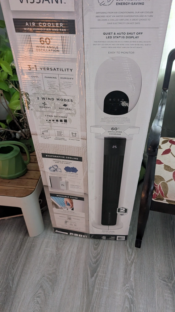 Selling a Vissani 3-in-1 Portable Evaporative Air Cooler, Tower Fan & Humidifier for 320 Sq. Ft. with Remote Control. It is brand new in box. Model # AC120-19AR. Retails for $164. Pick up Only