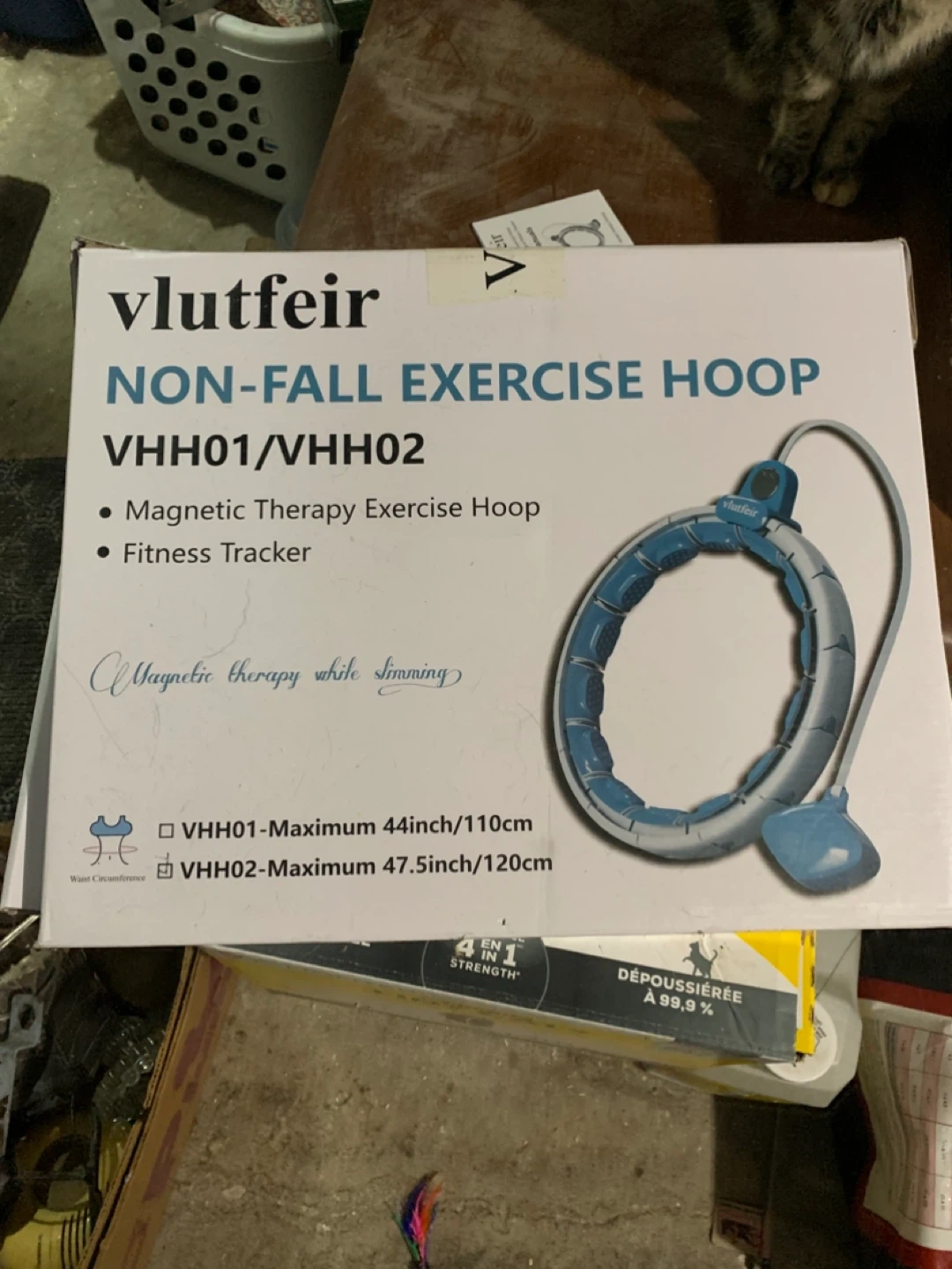 Selling a vlutfeir Non-Fall Exercise Hoop, model VHH01/VHH02. It comes with a magnetic massage and fitness tracker. The box and user manuals are included. - VHH01 has a maximum circumference of 44 inches/110 cm - VHH02 has a maximum circumference of 47.5 inches/120 cm