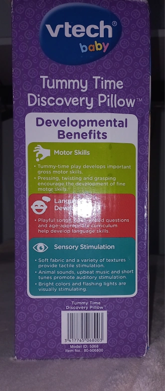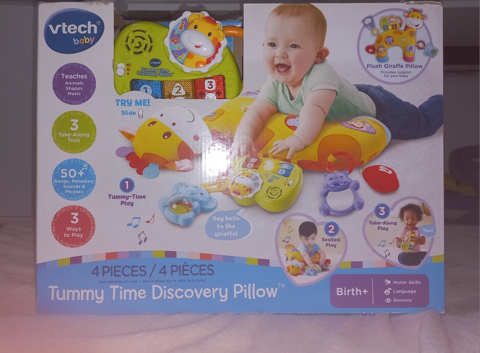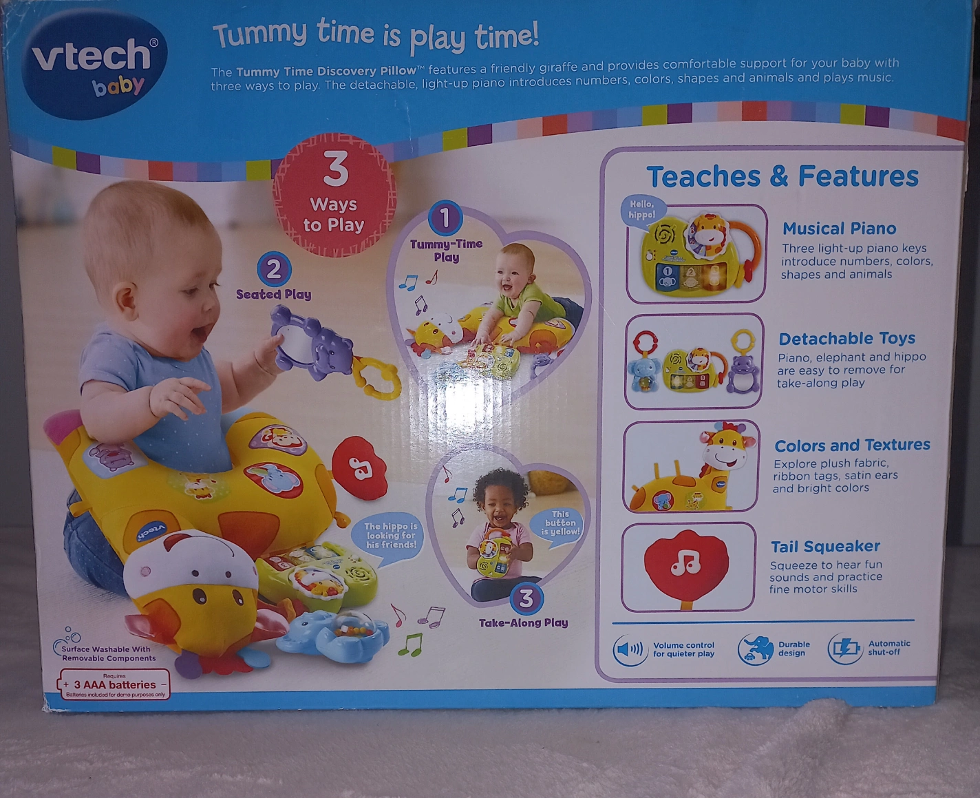 Selling a VTech Baby Tummy Time Discovery Pillow! It's great for tummy time play, seated play, and take-along play. Comes with musical piano keys that introduce numbers, colors, shapes and animals, plus detachable toys like a piano, elephant and hippo that are easy to remove for take-along play. The pillow also features colors and textures to explore, including plush fabric, ribbon tags, satin ears and bright colors. There's even a tail squeaker to encourage fine motor skills! Includes volume control for quieter play, durable design, and automatic shut-off