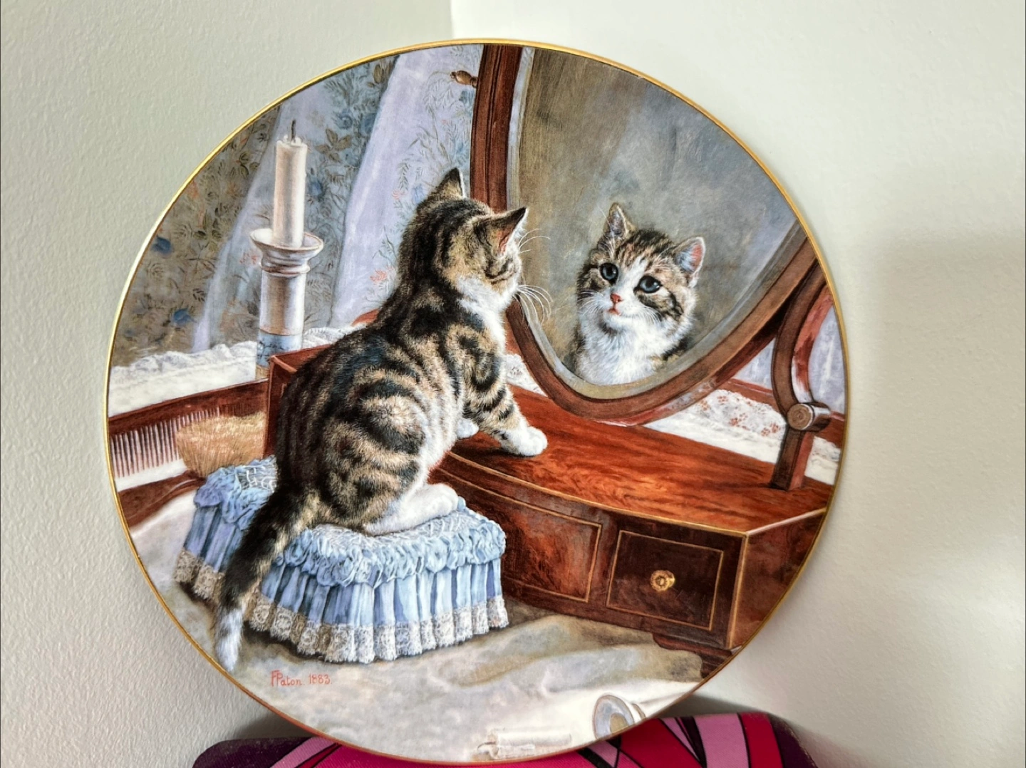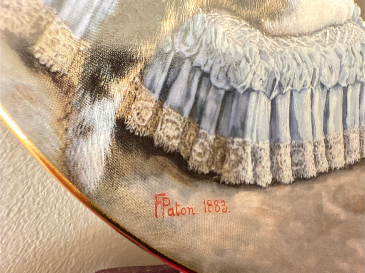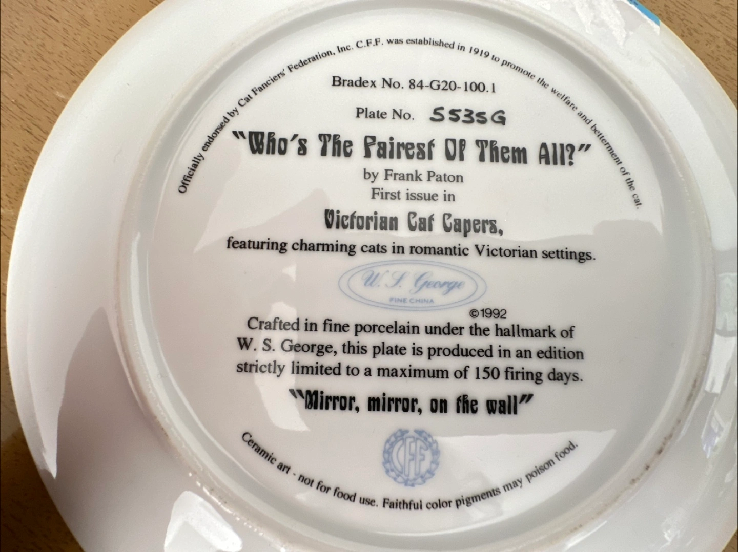 W.S. George fine china plate titled "Who's The Fairest Of Them All?" from the Victorian Cat Capers series. It's the first issue in the series, featuring charming cats in romantic Victorian settings. It's crafted in fine porcelain and produced in an edition strictly limited to a maximum of 150 firing days. The plate is officially endorsed by Cat Fanciers Federation, Inc. C.F.F. was established in 1919. Diameter approximately 8 inches