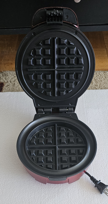 Red Chefman brand waffle maker. Makes four waffles at a time. Includes a temperature control knob and a non-stick surface. Comes with power cord. Lightly used.