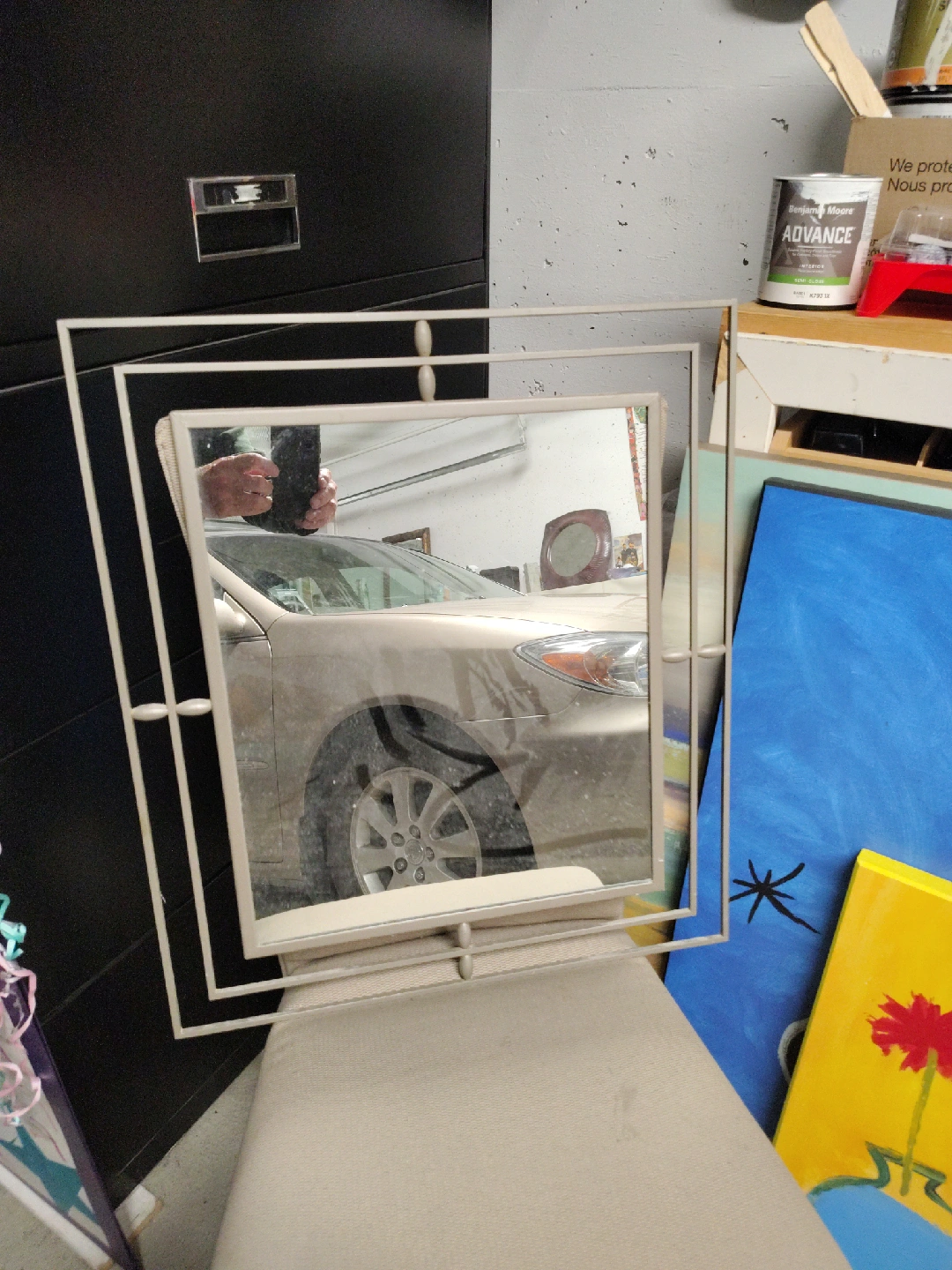 Selling a wall mirror with a unique decorative frame. It's in good condition and ready to add a touch of style to your home! The frame has a layered square design.