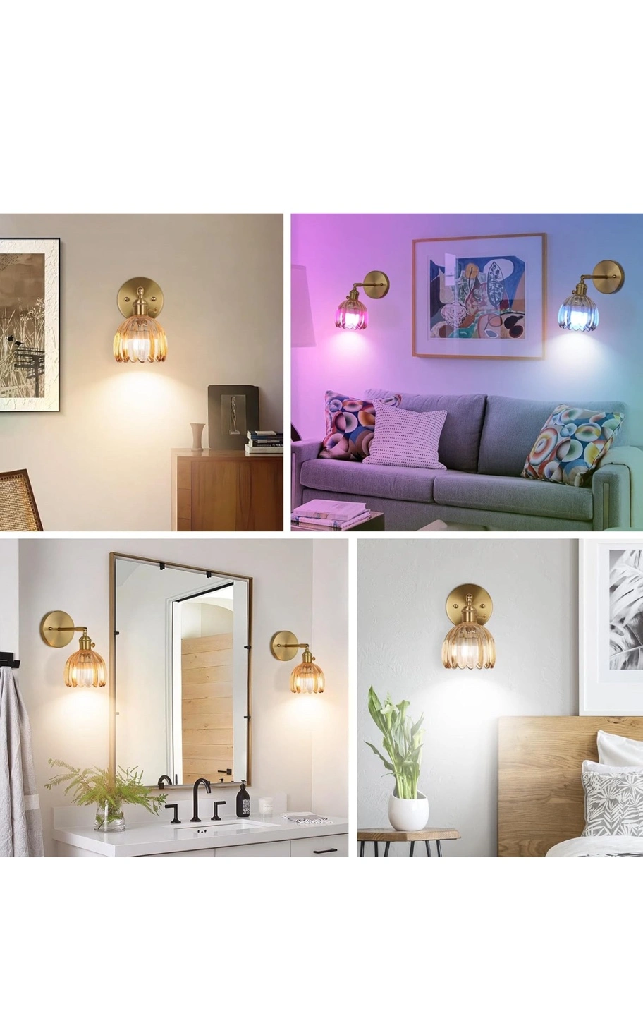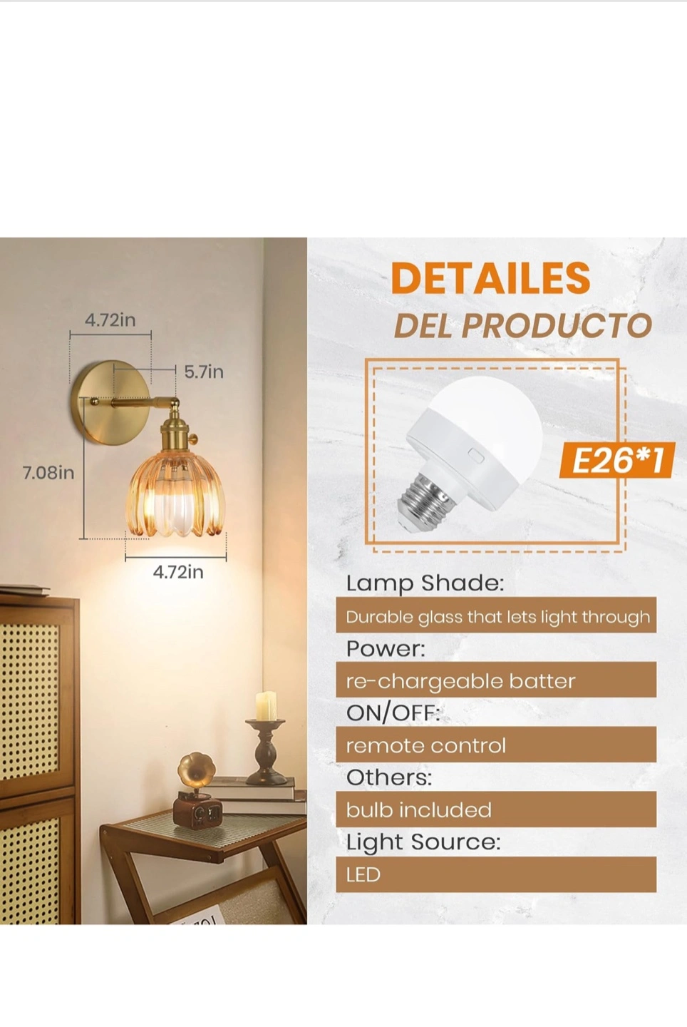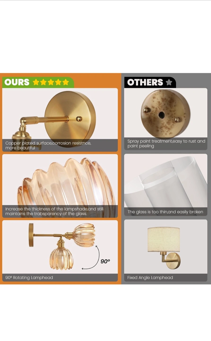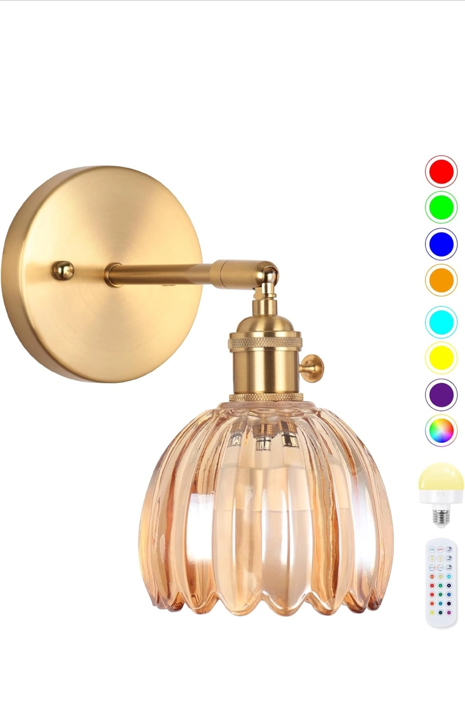 Add a touch of elegance to your home with this beautiful wall sconce! The lamp shade is made of durable glass and lets light through perfectly. Key features: - Copper plated surface for corrosion resistance - 90° rotating lamphead - Includes a remote control and LED light source Dimensions: - 4.72in x 5.7in x 7.08in