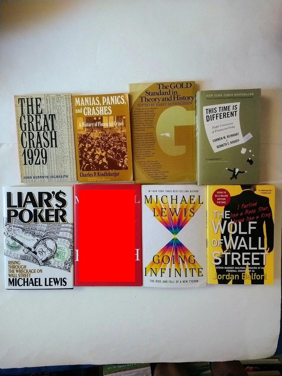 Location: Yonge and College /downtown Toronto $7 each. Cash only; prices are firm. - The Great Crash: 1929 - John Kenneth Galbraith - Manias, Panics, and Crashes: A History of Financial Crises - Charles P. Kindleburger - The Gold Standard in Theory and History - Barry Eichengreen, ed - This Time Is Different: Eight Centuries of Financial Folly - Carmen M. Reinhart & Kenneth S. Rogoff - Liar's Poker: Rising Through the Wreckage on Wall Street - Michael Lewis - Going Infinite: The Rise and Fall of a New Tycoon - Michael Lewis - The Wolf of Wall Street - Jordan Belfort