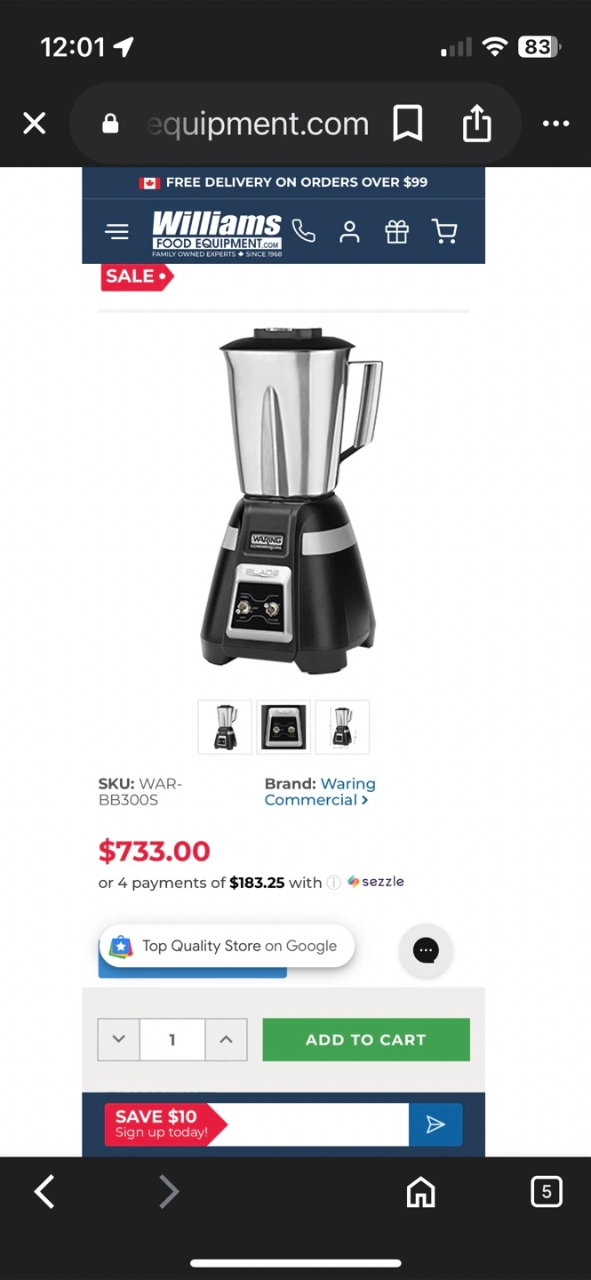Selling a Waring Commercial BB300S 1 HP blender. It features easy-to-clean electronic touchpad controls and an industrial stainless steel blade. It can blend three 16 oz margaritas in 15 seconds or less. The blender has a 2-speed motor with pulse function. Originally listed at $733.00