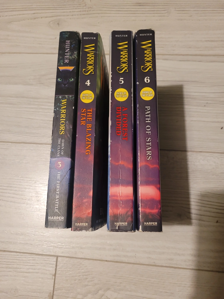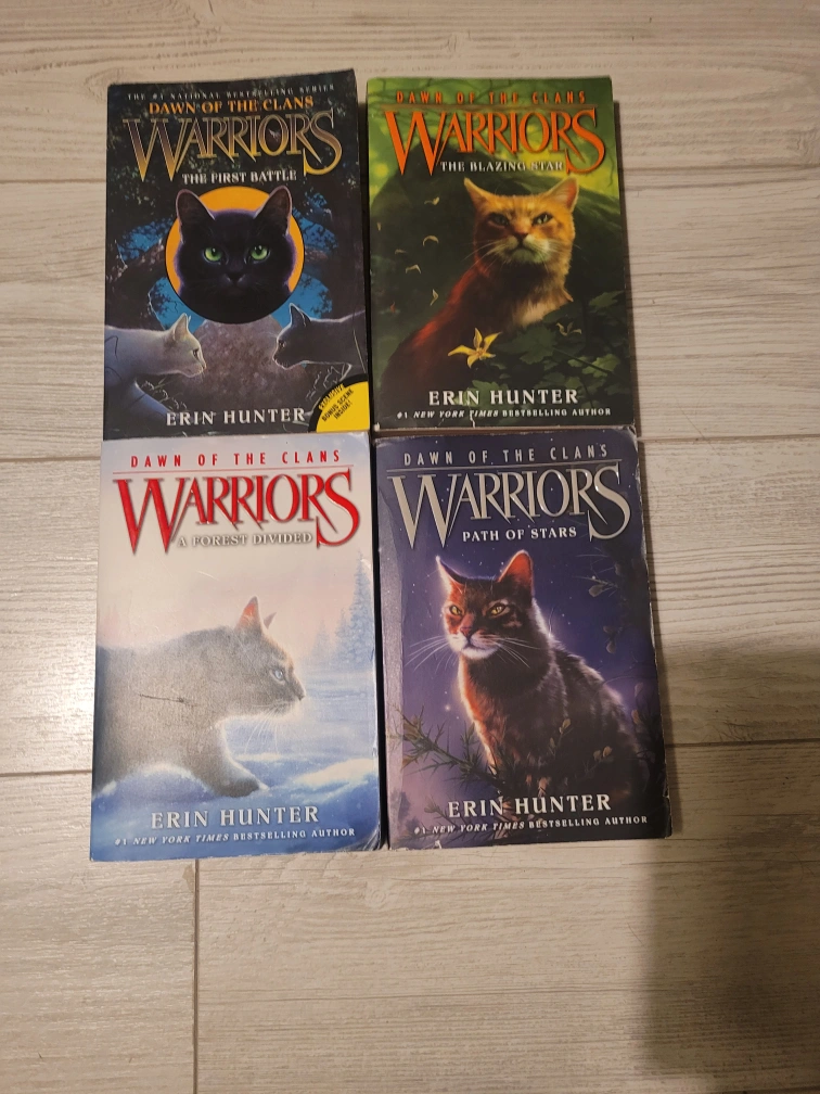 Selling the Warriors: Dawn of the Clans book series by Erin Hunter! Included are books 3 through 6: The First Battle, The Blazing Star, A Forest Divided, and Path of Stars. Perfect for any Warriors fan or young reader!