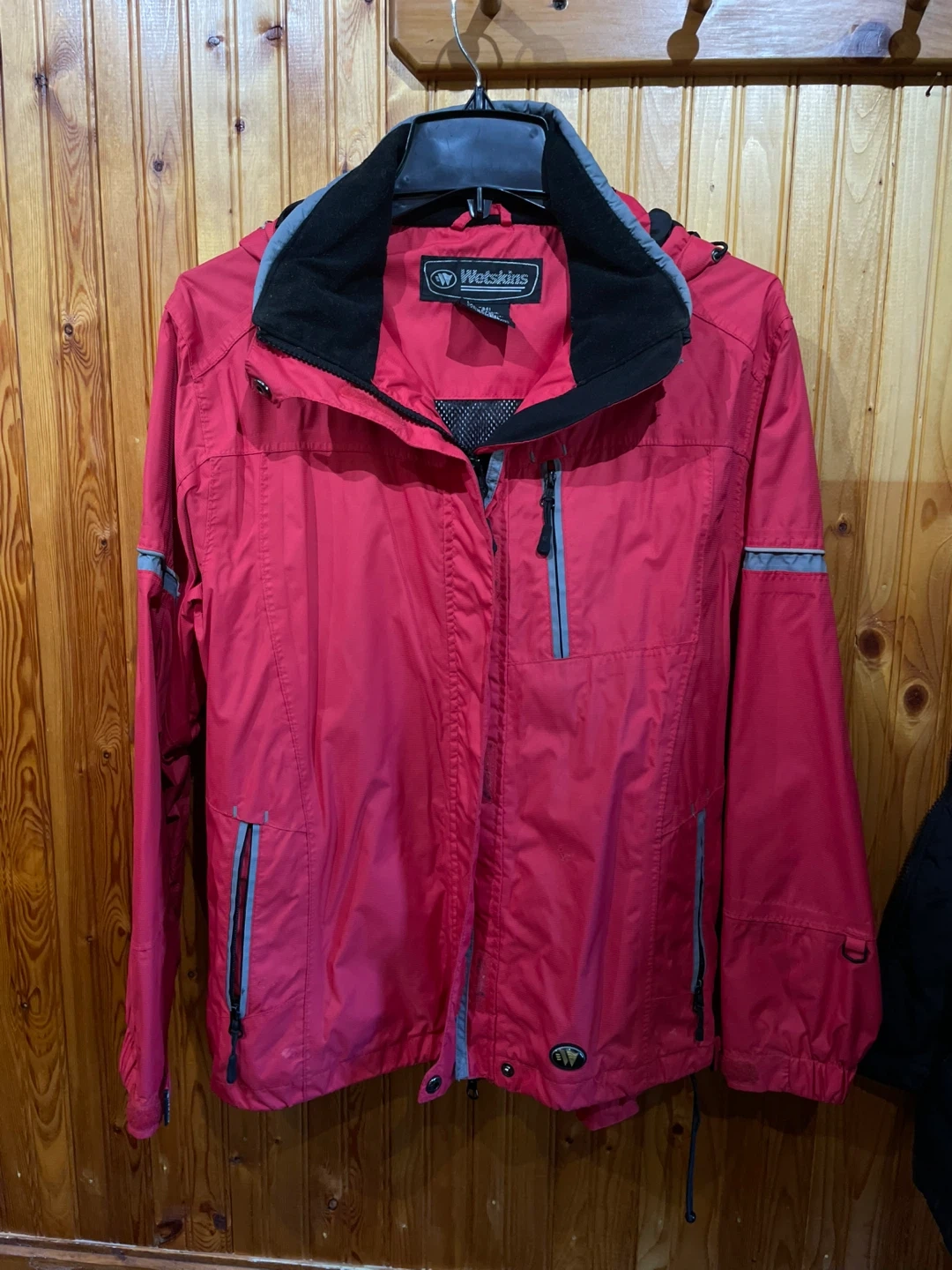 Selling a Watkins ladies jacket in size medium. The shell is made of 100% nylon and the lining is 100% polyester. It's a vibrant red colour and in great condition!