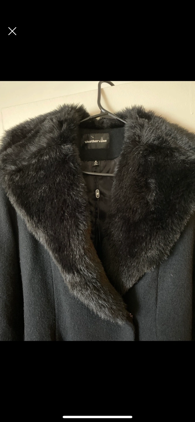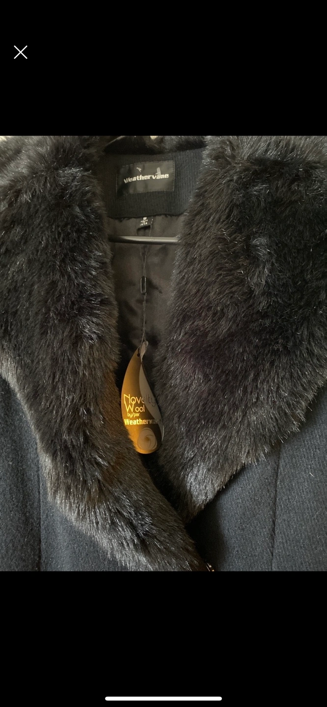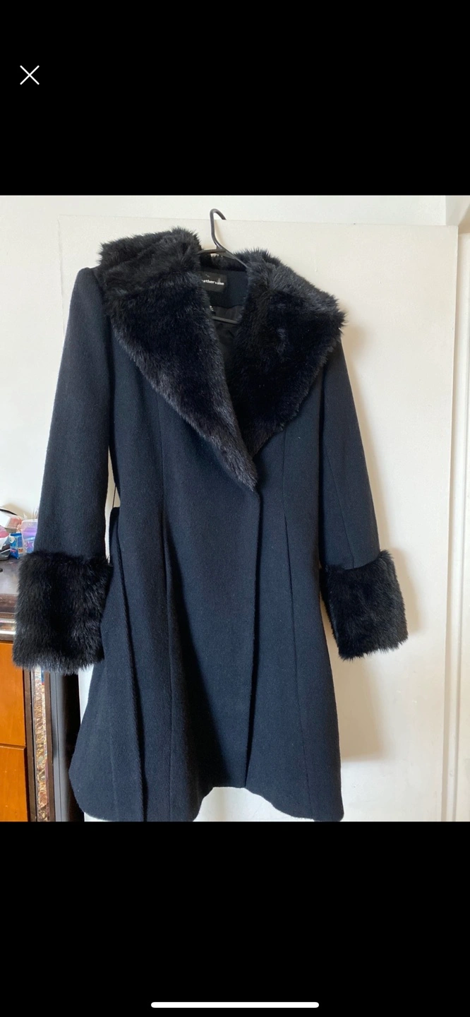 Black coat with faux fur collar and cuffs. Belted. Size M.