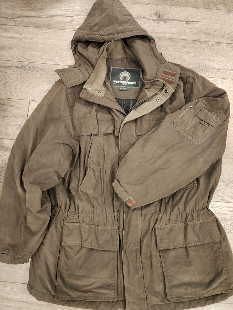 Selling a Weatherproof jacket in olive green. It features a hood and multiple pockets. Great for those cooler days!