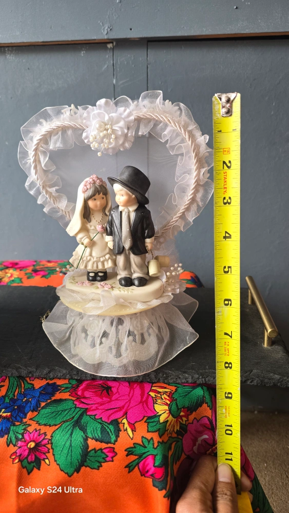 This is a sweet wedding cake topper figurine. It features a bride and groom under a heart-shaped arch. A perfect addition to any wedding celebration!