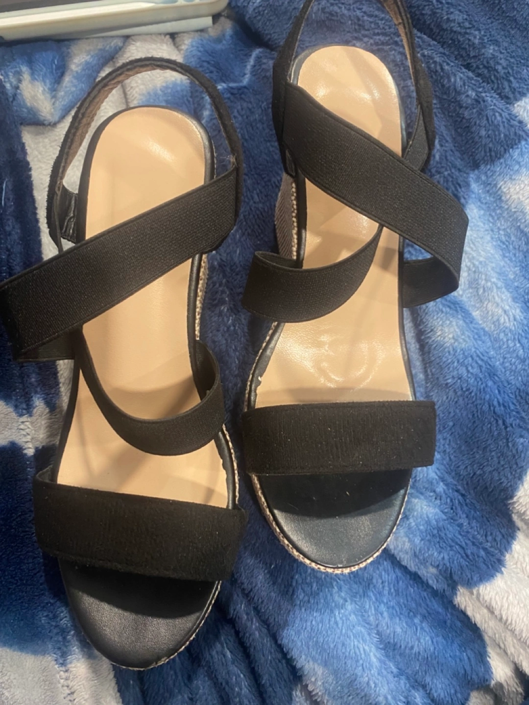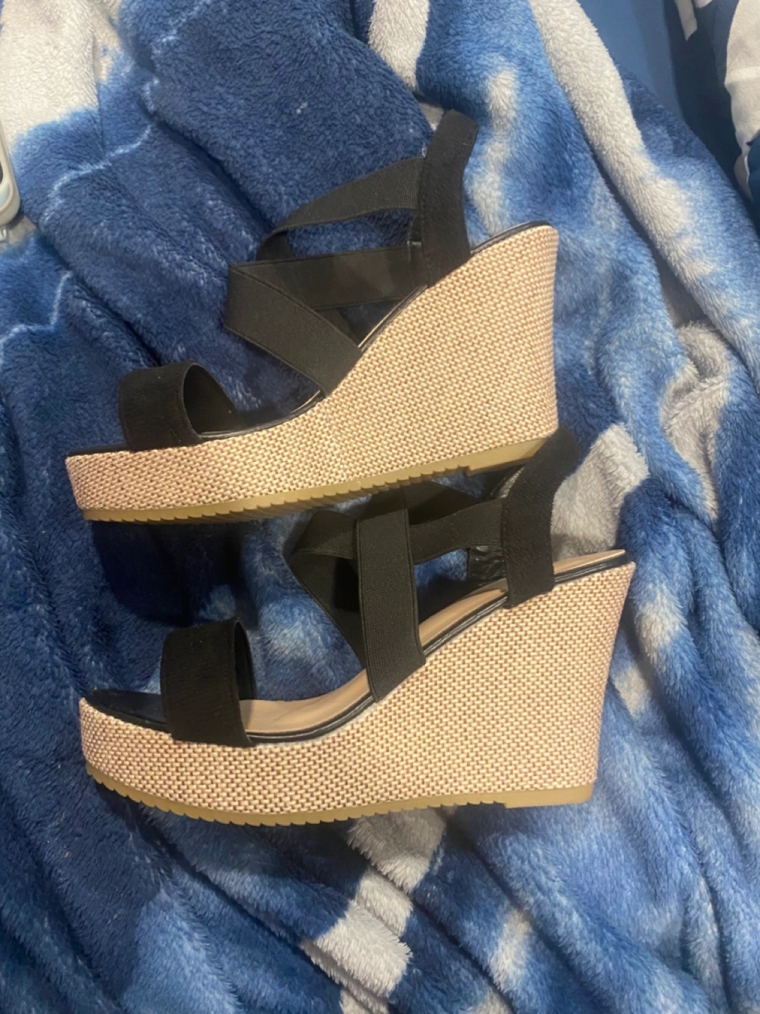 Selling a pair of cute wedge sandals! They're a size 7 and feature black straps with a woven wedge heel. Perfect for adding a bit of height and style to your summer outfits!