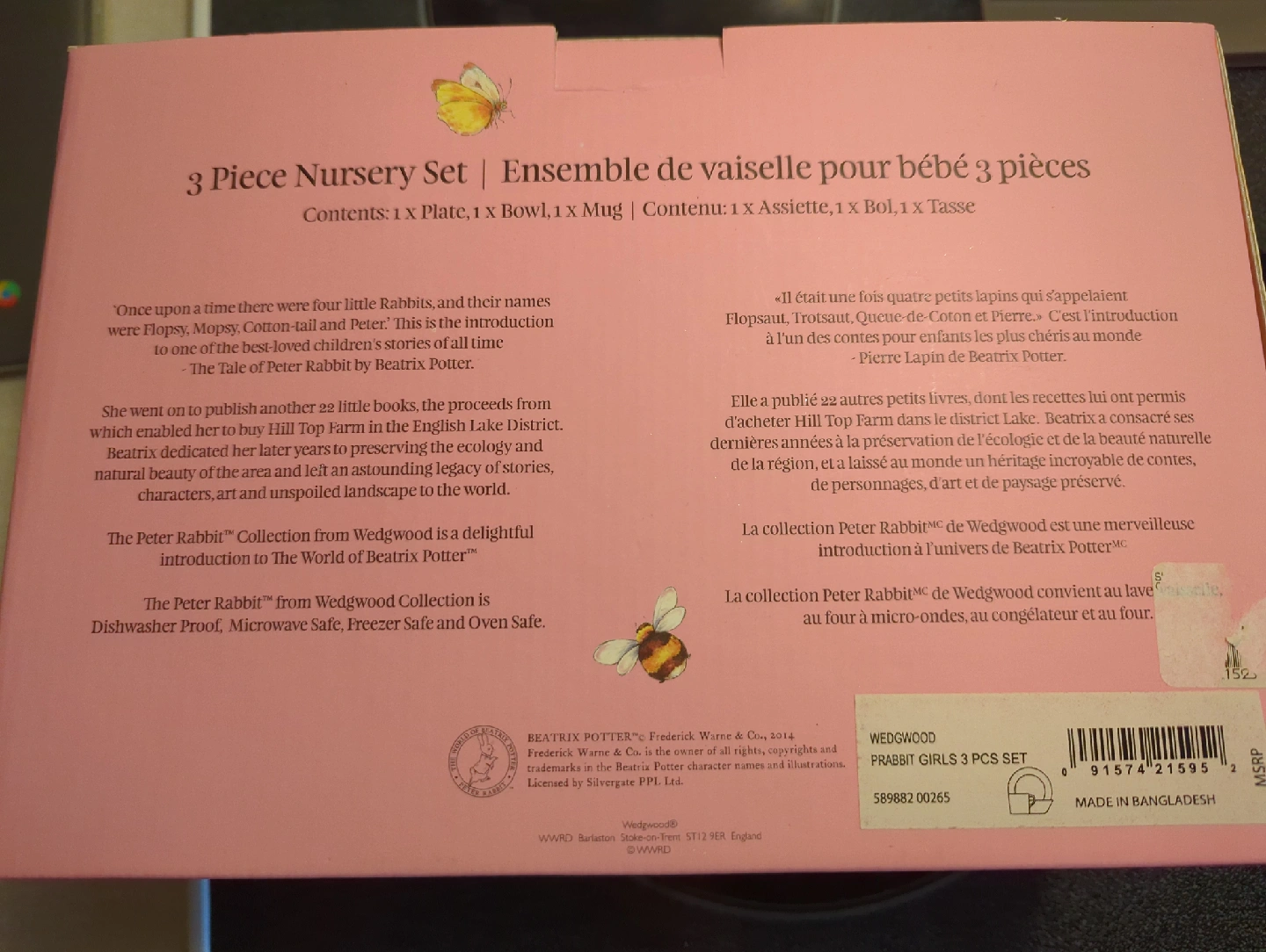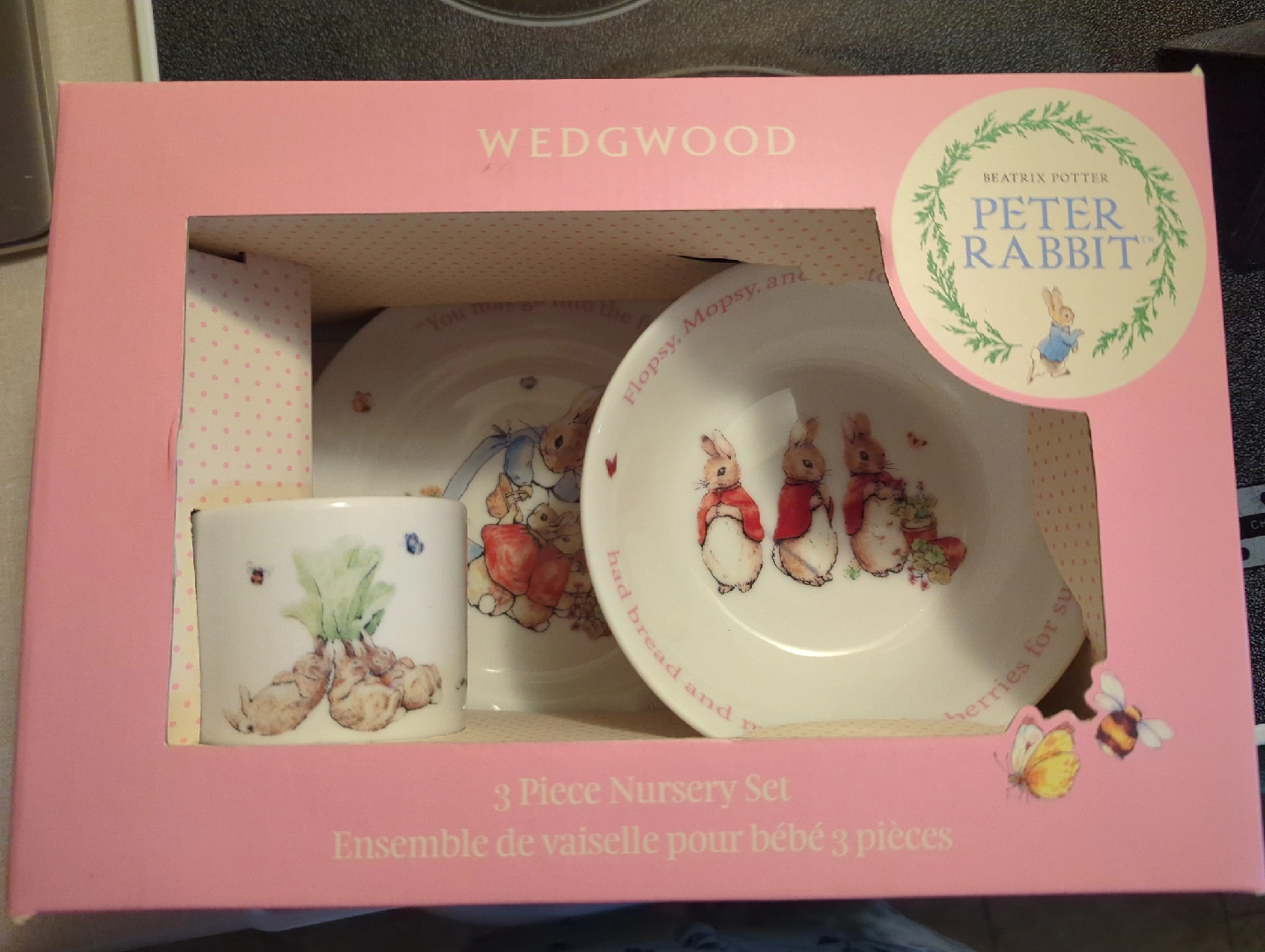 Selling a brand new Wedgwood Peter Rabbit 3-piece nursery set. It includes a plate, bowl, and mug, all featuring adorable Peter Rabbit designs. The set is dishwasher, microwave, freezer, and oven safe. Comes in the original box!