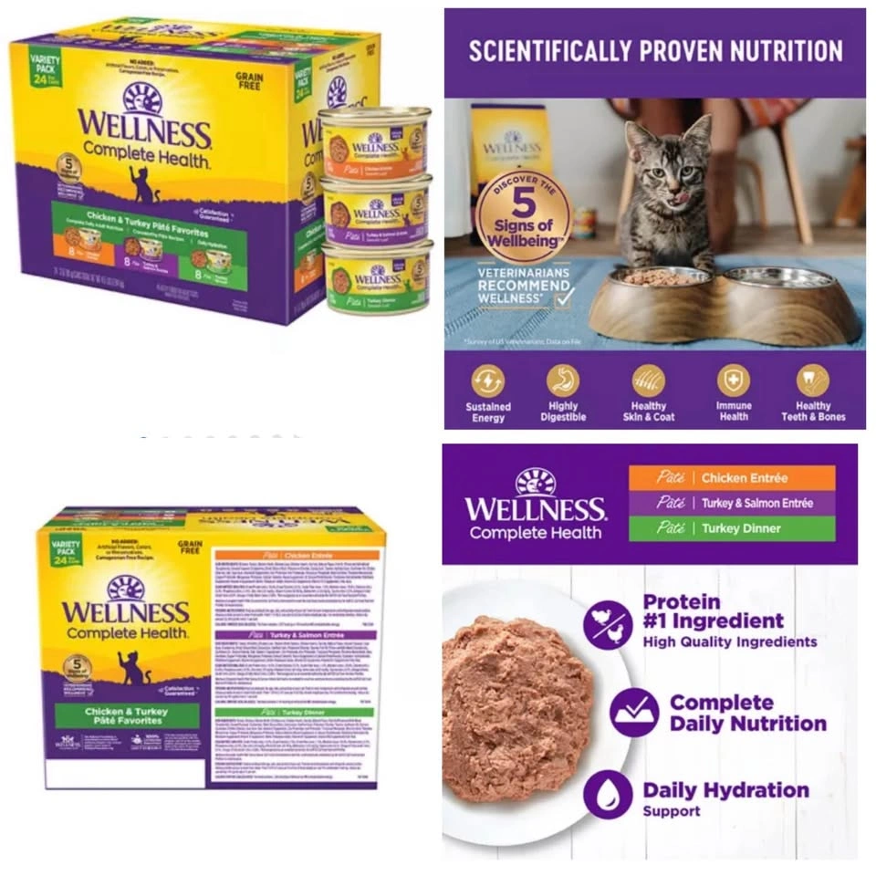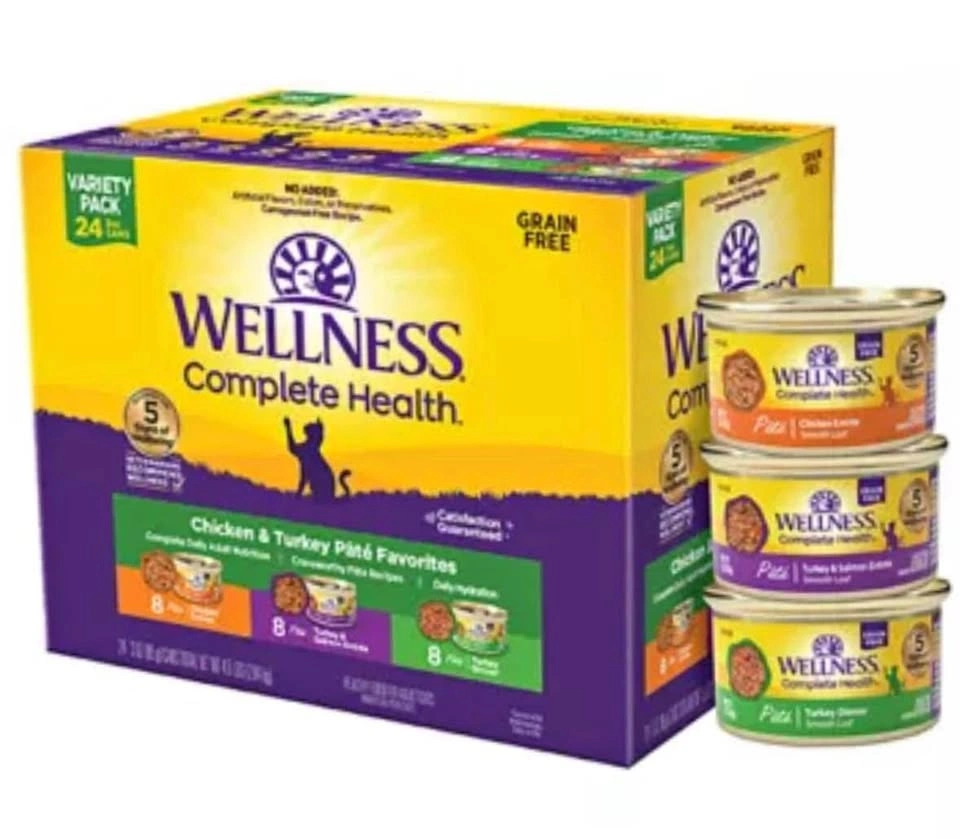 Selling a 24 variety pack of Wellness Complete Health cat food. This pack includes Chicken & Turkey Pate Favorites. It's a great way to give your cat a balanced and nutritious diet with high-quality ingredients for daily hydration and complete daily nutrition.