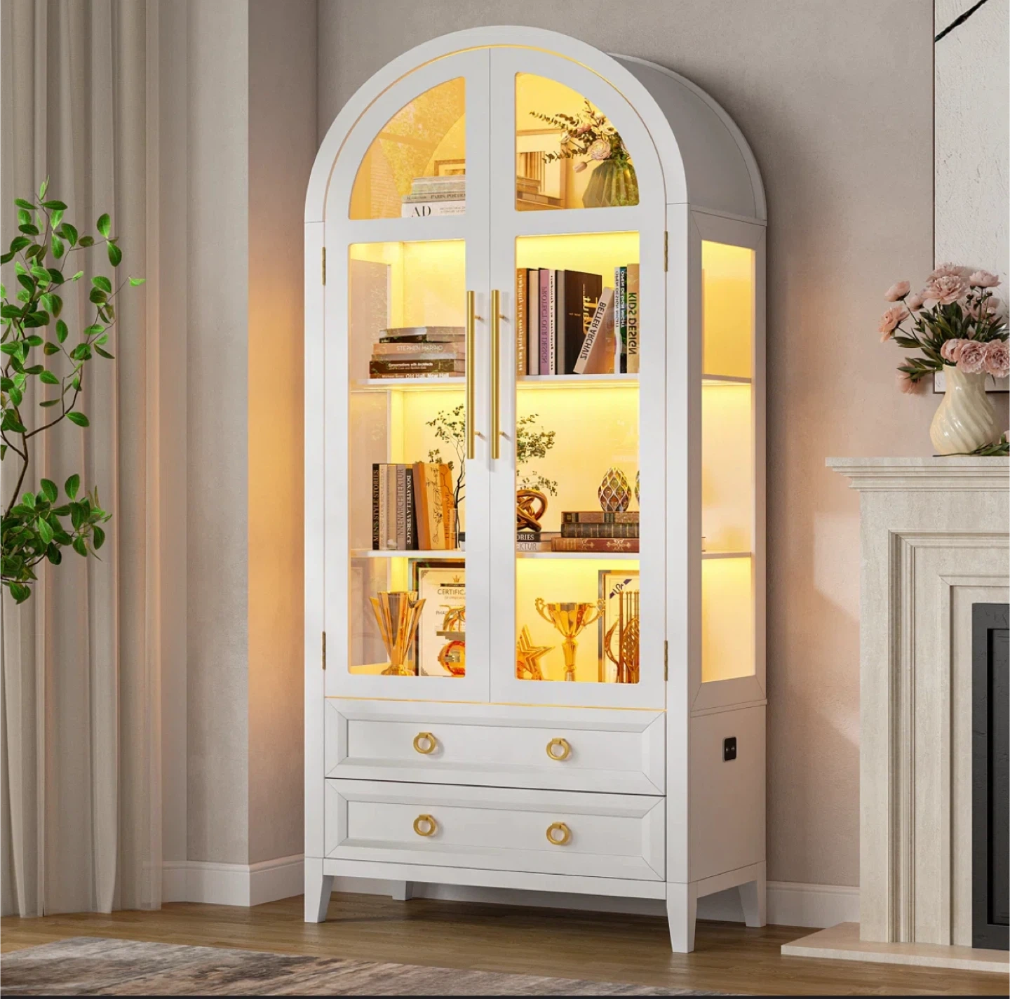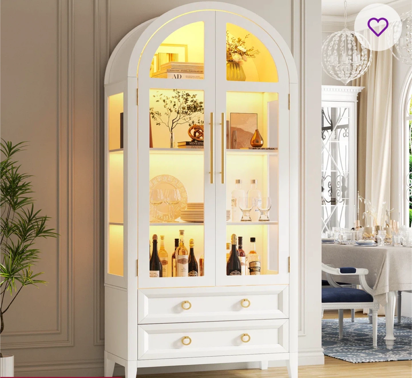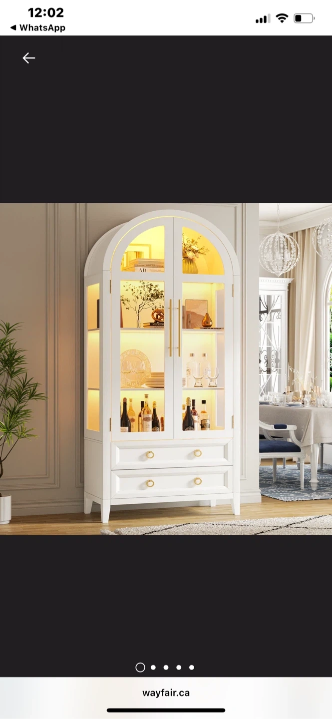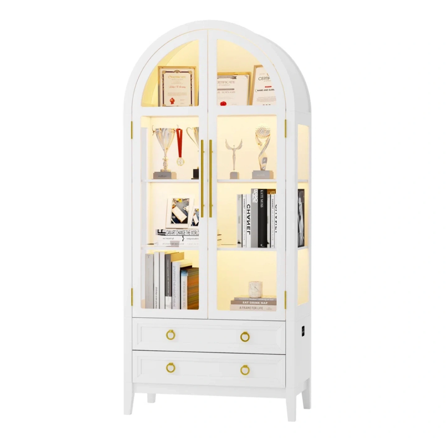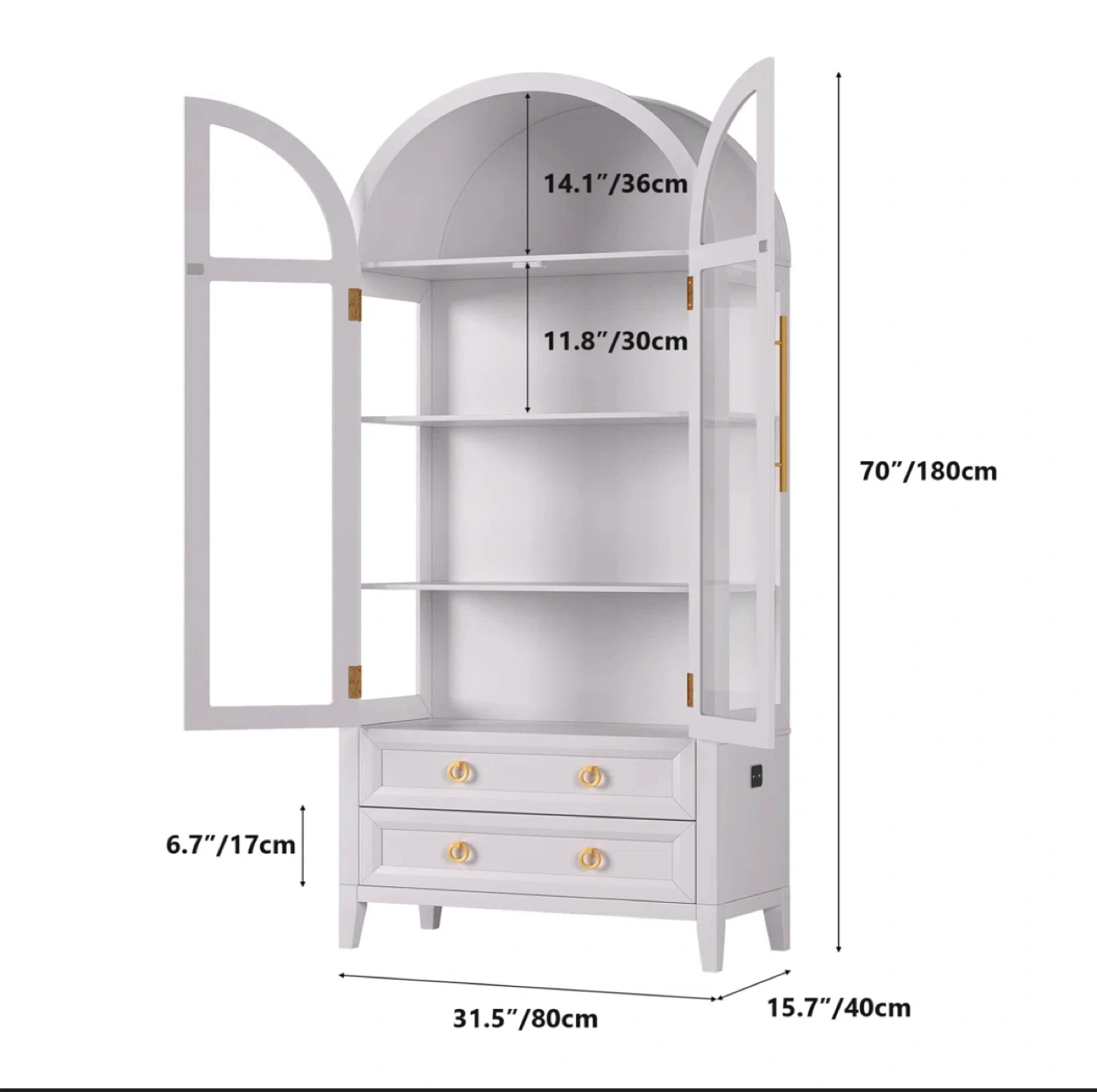 Selling a lovely white arched display cabinet! It features glass doors, interior shelving, and two drawers at the bottom for extra storage. The dimensions are approximately: - Height: 70" / 180cm - Width: 31.5" / 80cm - Depth: 15.7" / 40cm The shelves have varying depths of 14.1" / 36cm and 11.8" / 30cm. The drawers are 6.7" / 17cm in height