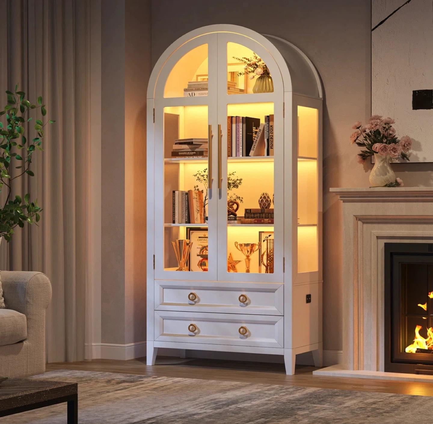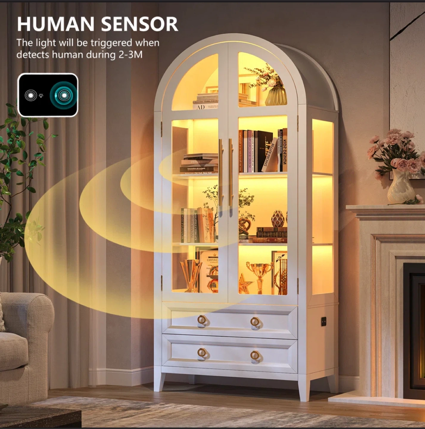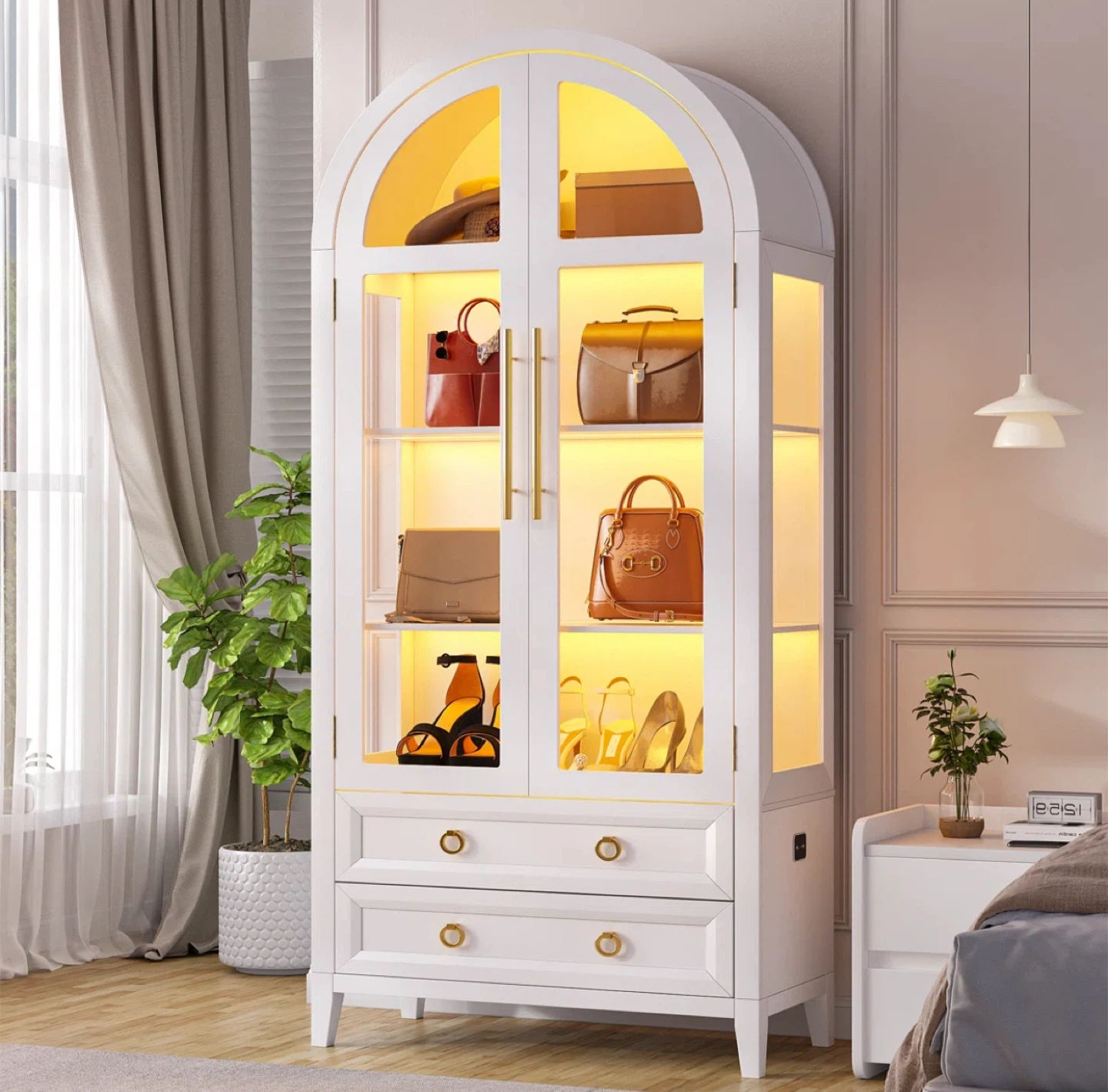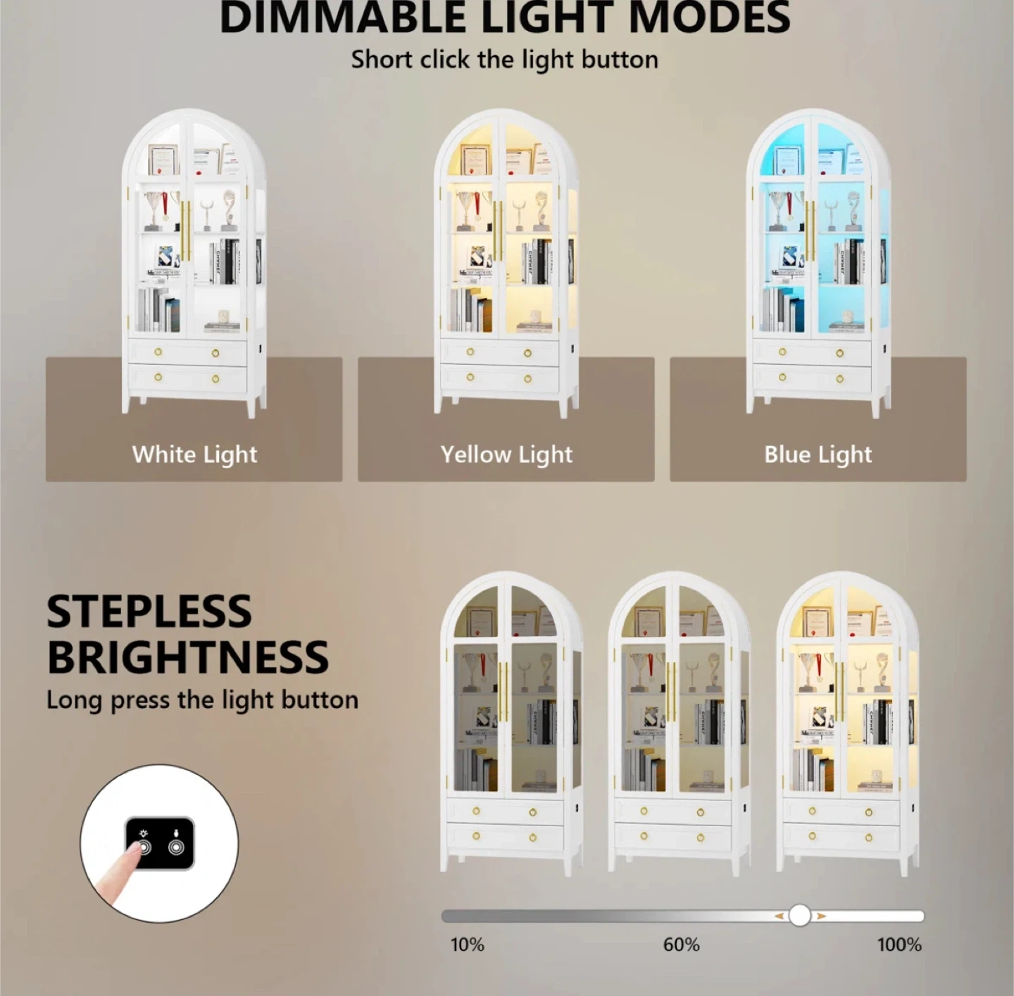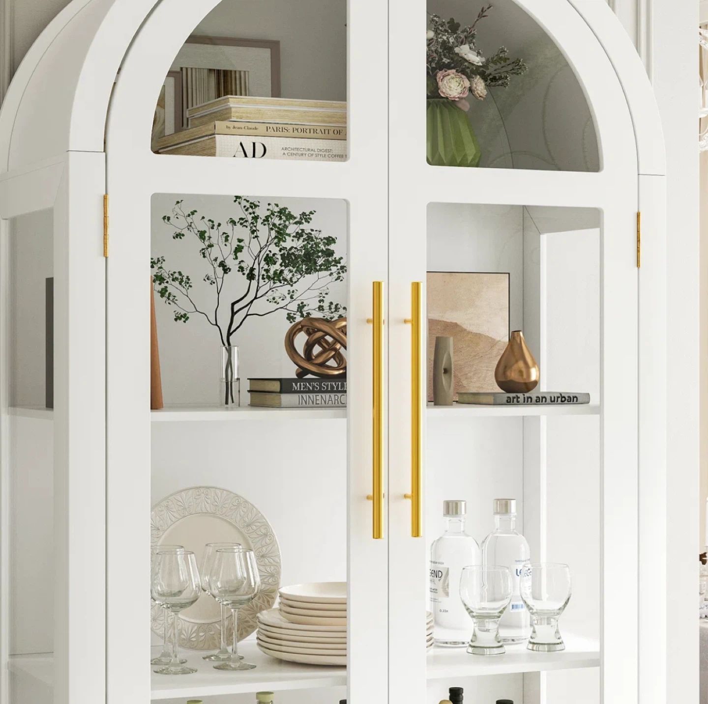 Selling a lovely white arched display cabinet! It features glass doors, interior shelving, and two drawers at the bottom for extra storage. The dimensions are approximately: - Height: 70" / 180cm - Width: 31.5" / 80cm - Depth: 15.7" / 40cm The shelves have varying depths of 14.1" / 36cm and 11.8" / 30cm. The drawers are 6.7" / 17cm in height