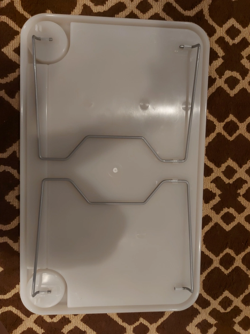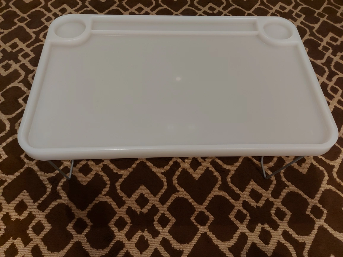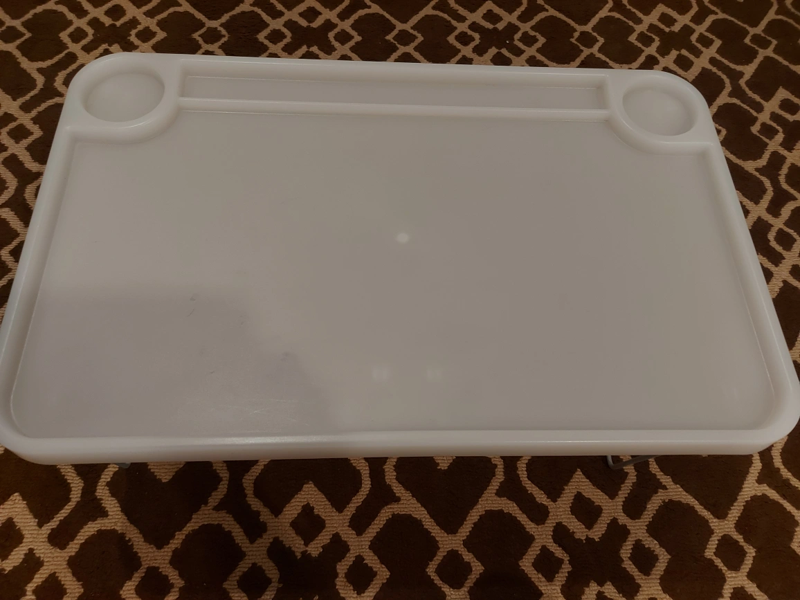 Selling a handy white bed tray table! It's perfect for breakfast in bed, working from home, or just a comfy night in. The legs fold for easy storage when you're not using it, and it has built-in cup holders