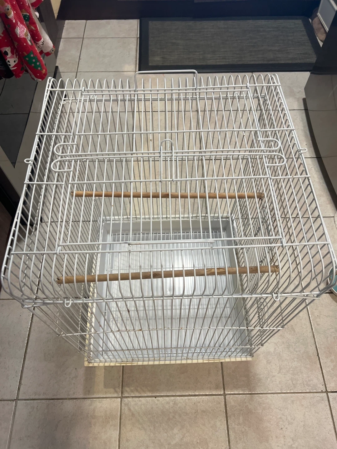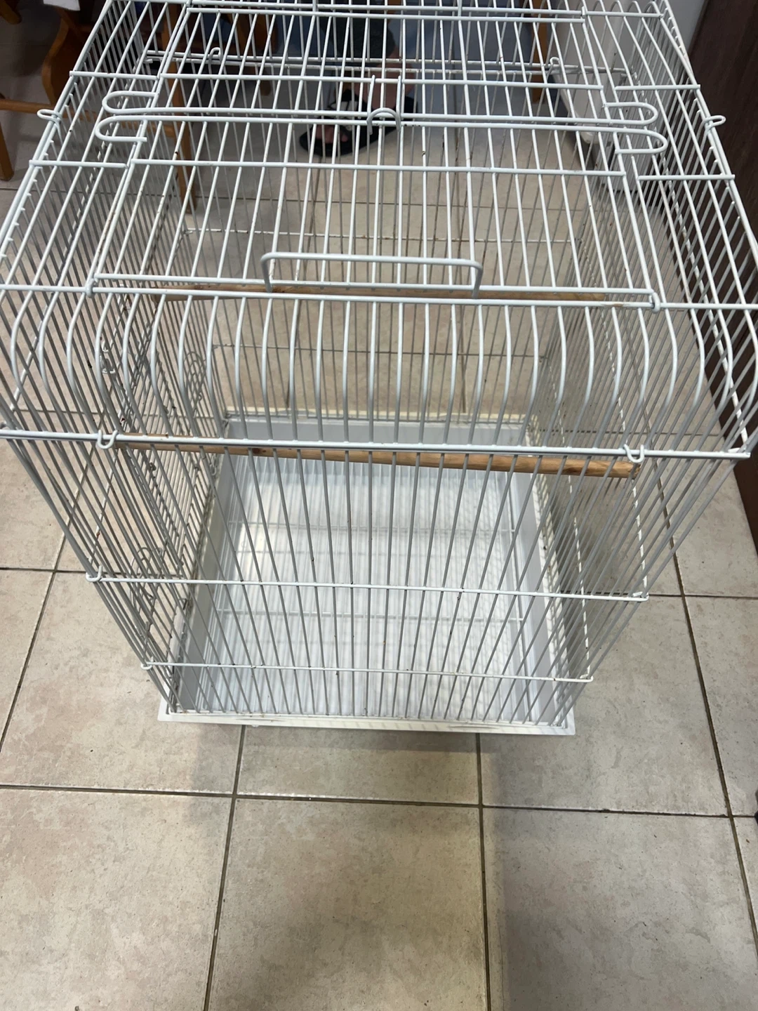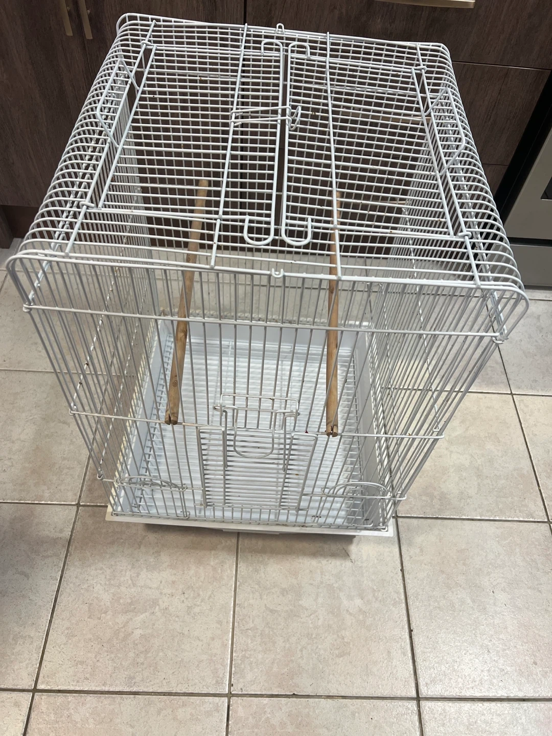 Selling a white bird cage. It's in good condition and ready for a new feathered friend! Includes wooden perches and a slide-out tray for easy cleaning