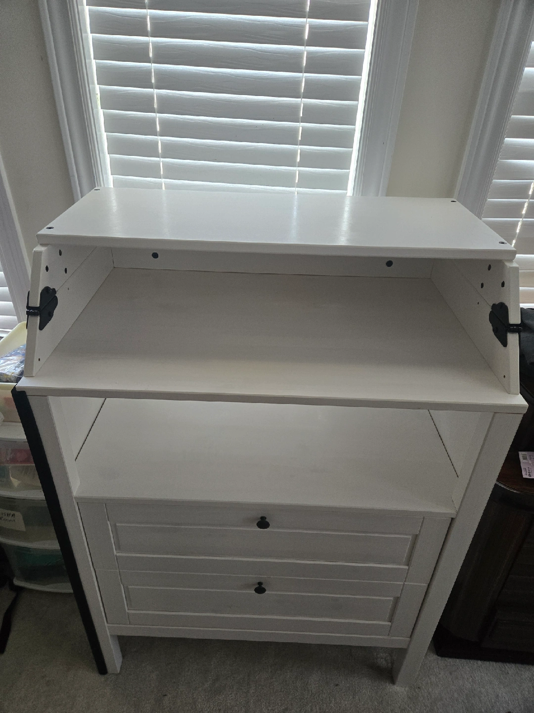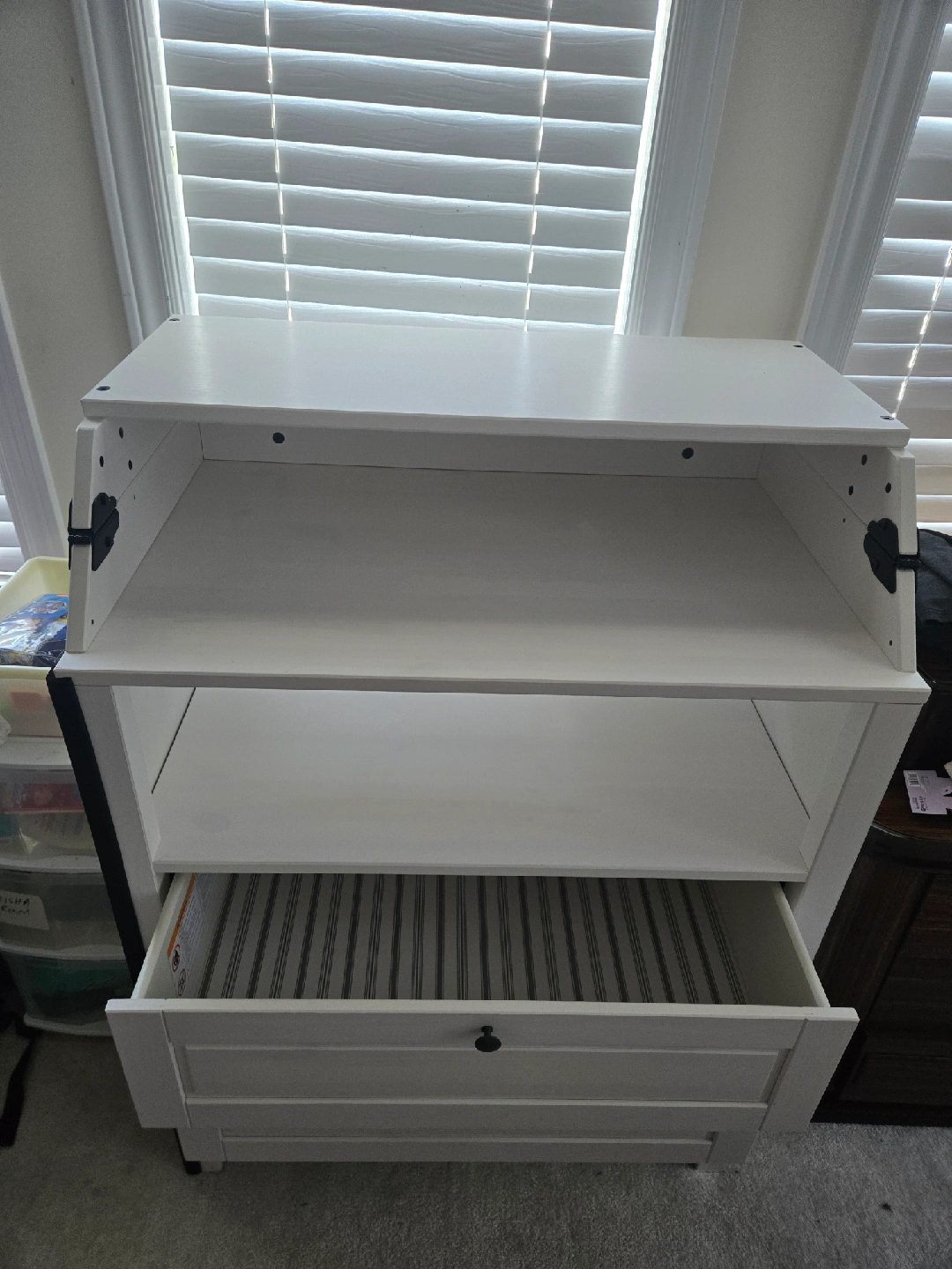 Selling a white Changing Table. Perfect for organizing your space. It features multiple shelves and drawers, offering ample storage. It's in great condition and ready for a new home