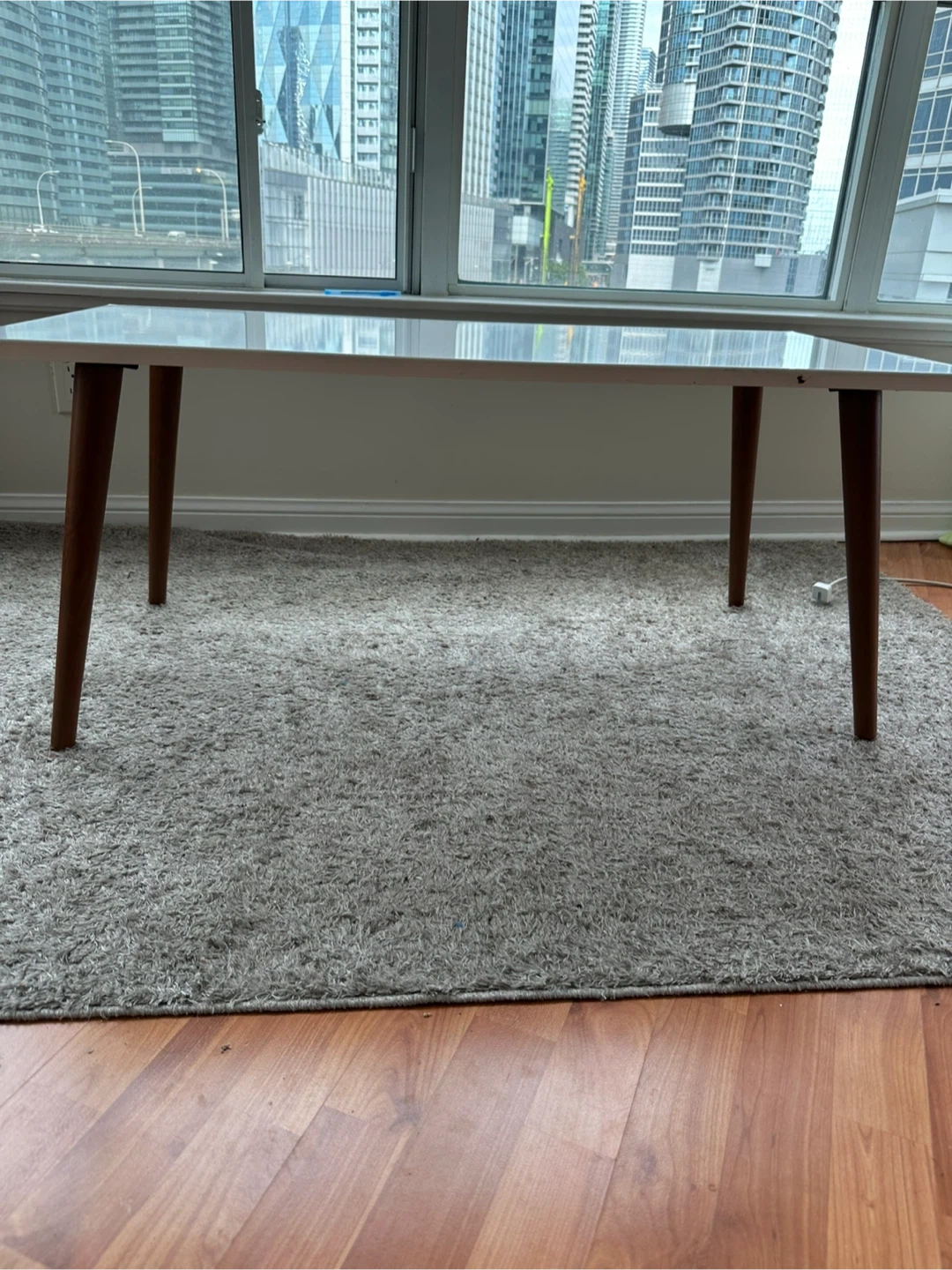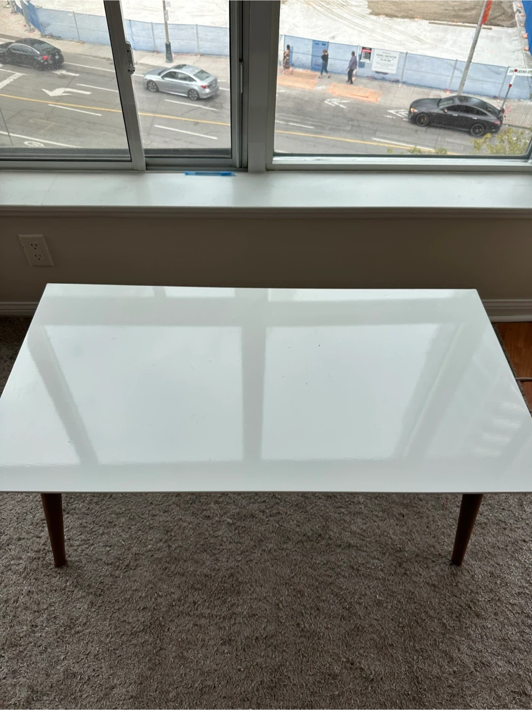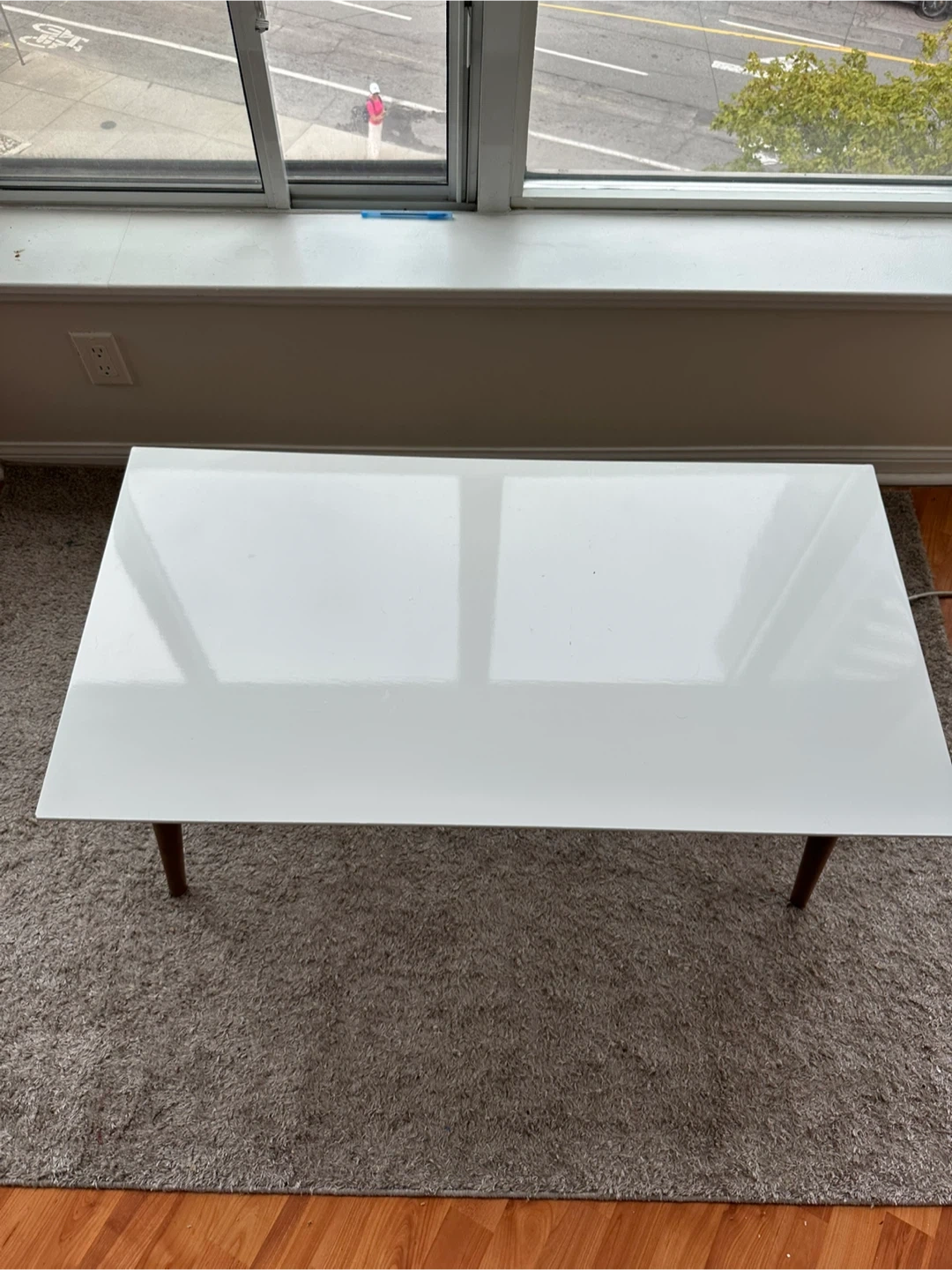 Selling a simple white coffee table with brown wooden legs. It's in great condition and would look great in any living space. Minor scratches on the top. Pick up only.