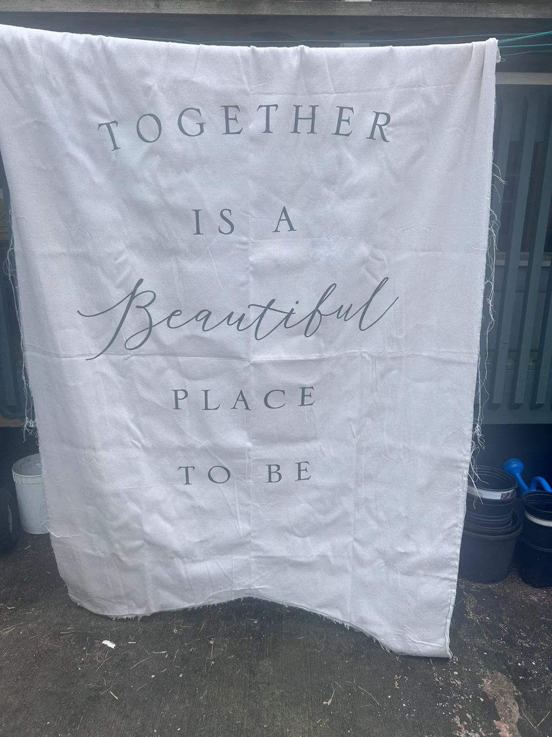 This is a white tapestry with the words "TOGETHER IS A Beautiful PLACE TO BE" printed on it. Beautiful large linen sign. 6ft x 4.3fl