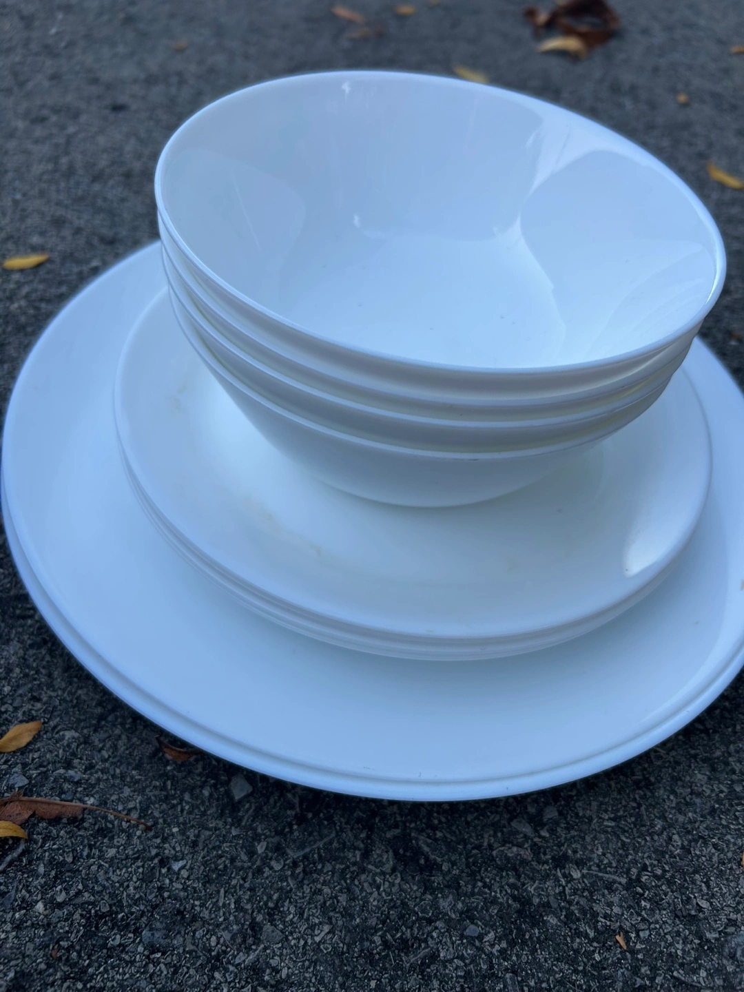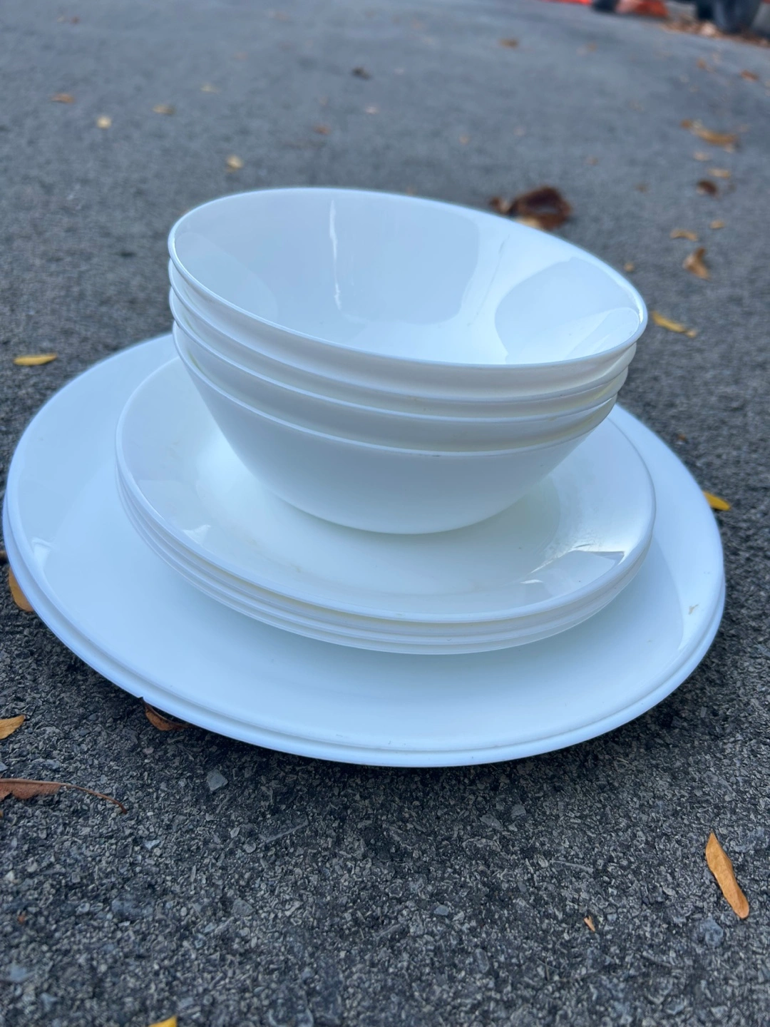 Selling a dinnerware set in classic white! It includes 2 dinner plates 4 dessert plates and 4 bowls, perfect for everyday use. This set is durable and lightweight, making it great for any kitchen. Add a touch of simplicity to your dining experience!