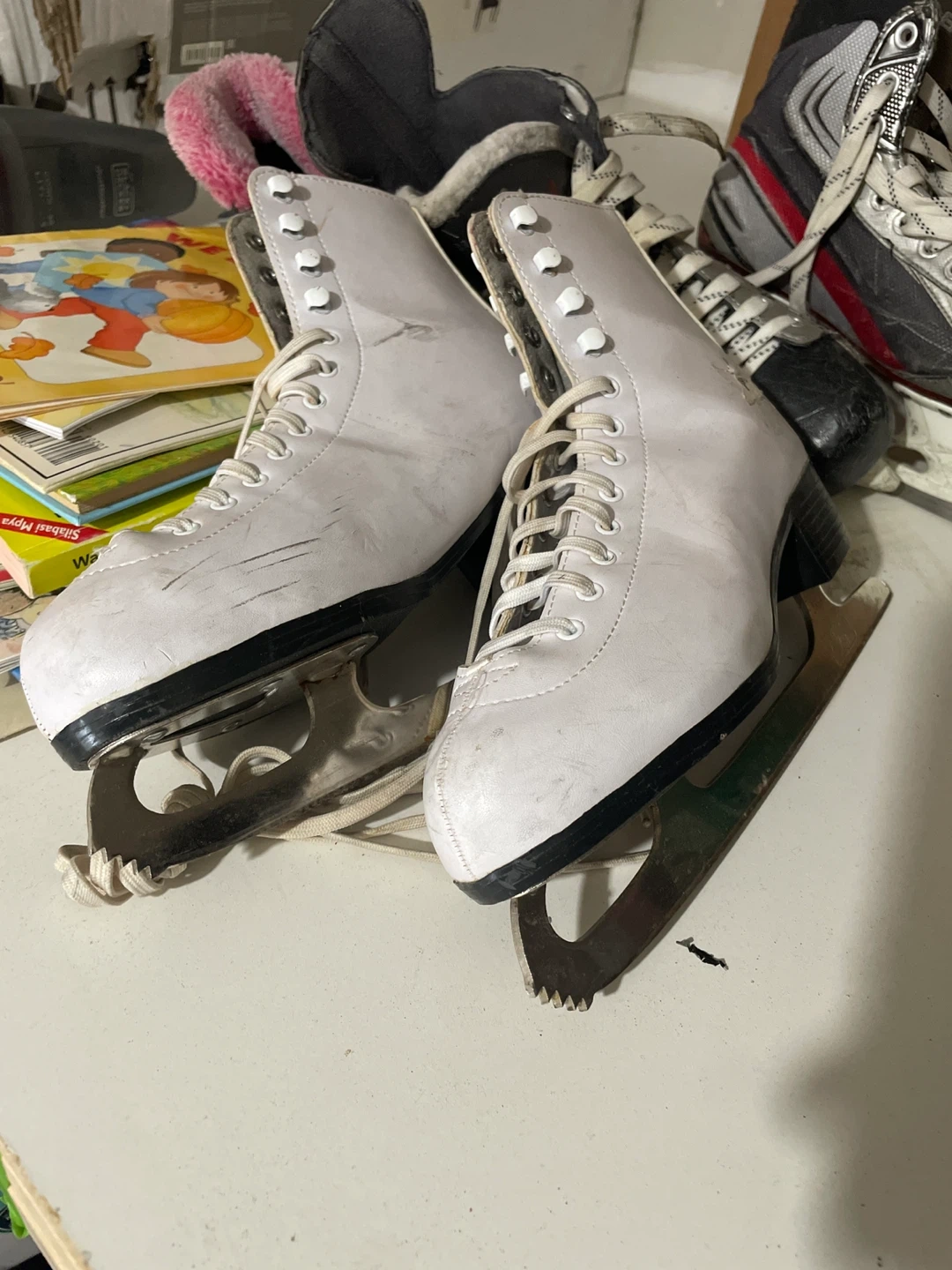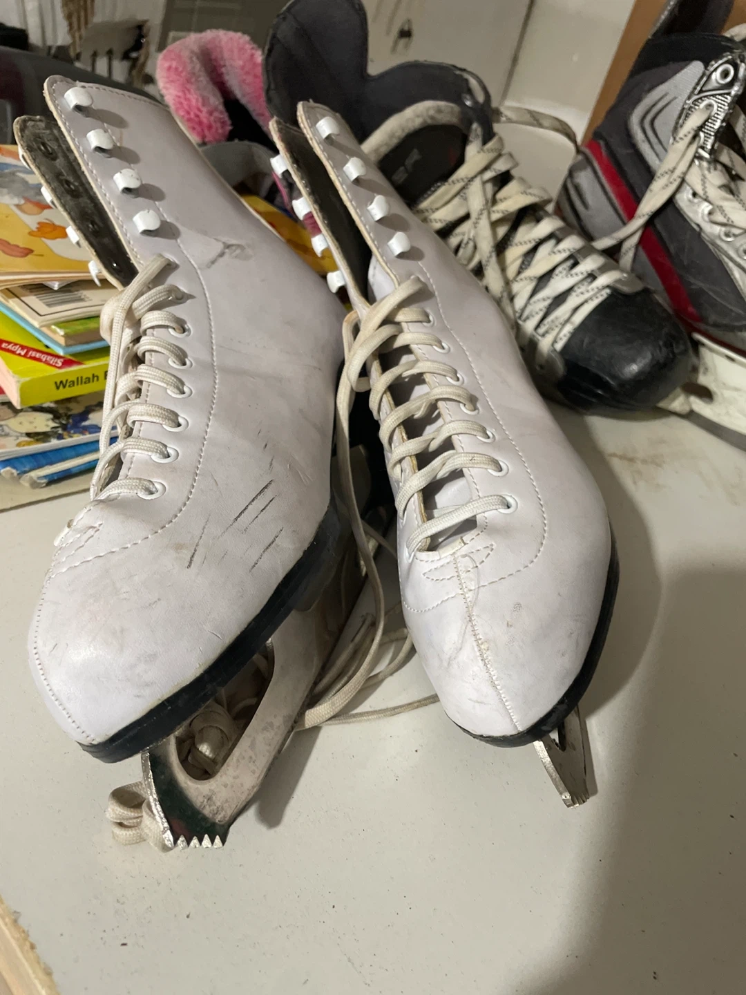 Selling a pair of white figure skates. They have some wear and tear, but are still in good condition for recreational skating. Perfect for beginners or anyone looking to enjoy some time on the ice!