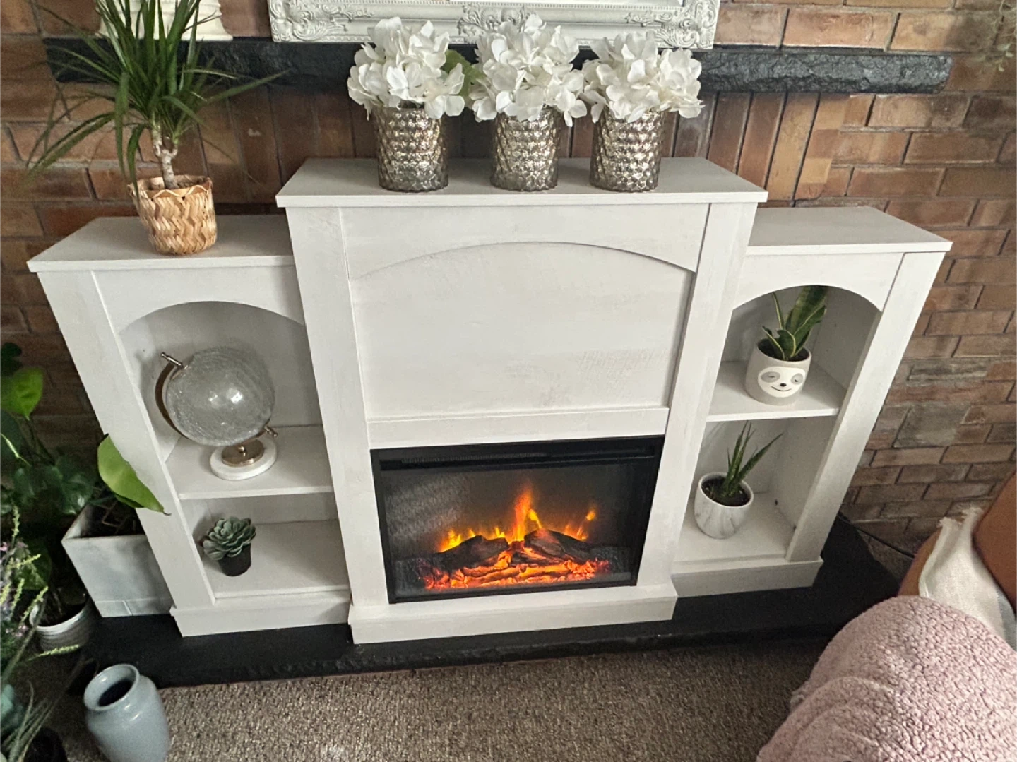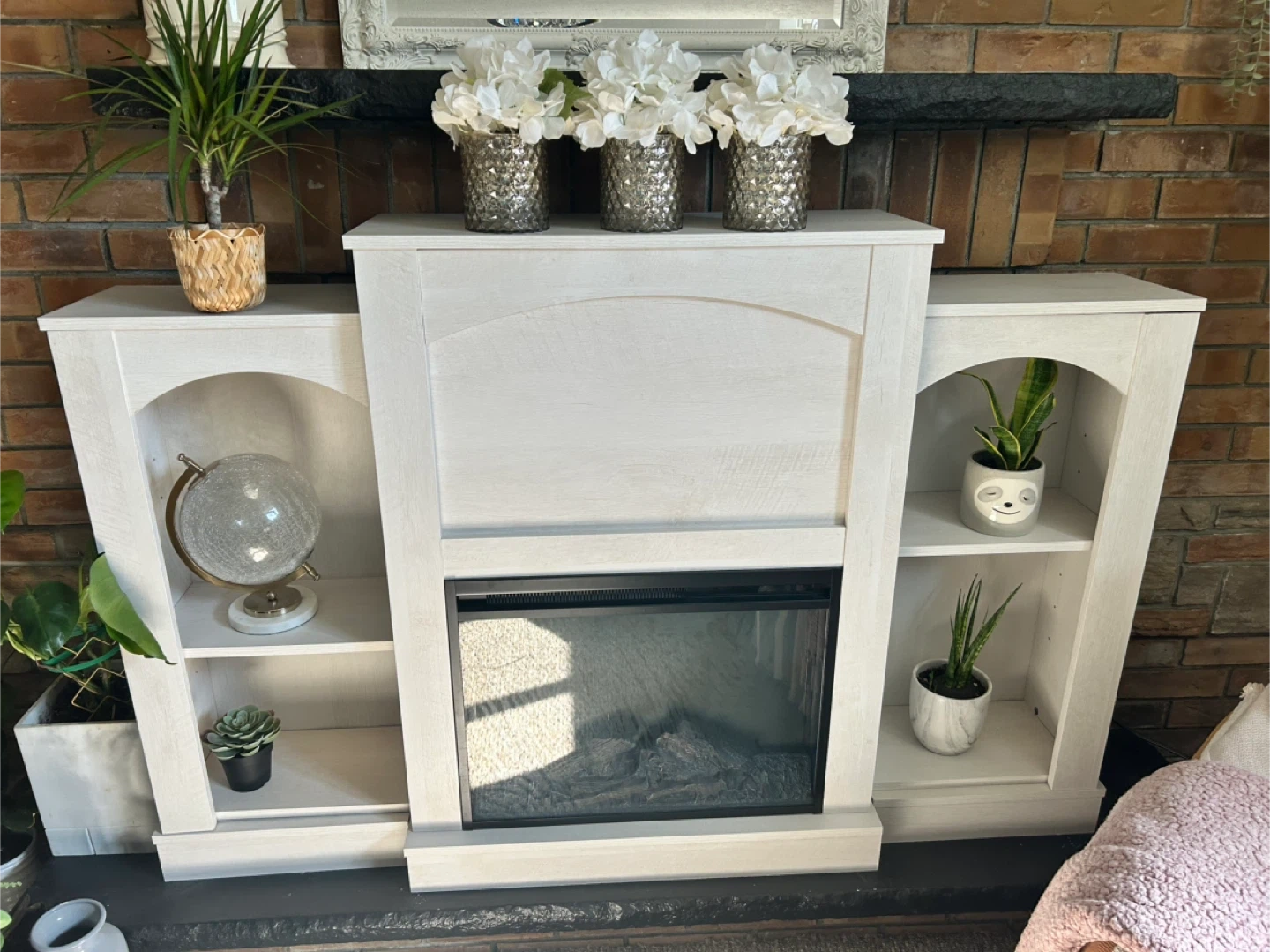 Selling a charming white fireplace with mantle- can be used as a TV stand! It features built-in shelves on either side, perfect for displaying your favourite books or decor. The fireplace adds a cozy touch to any living room. It's in great condition and ready for a new home!