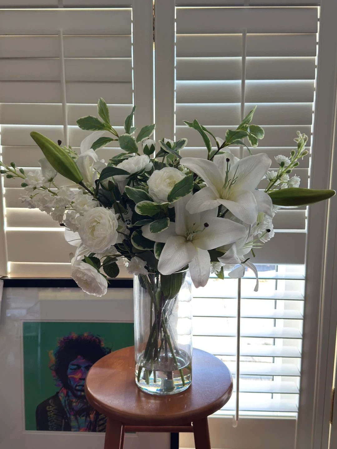 A beautiful white flower arrangement in a clear glass vase! Perfect for adding a touch of elegance to any room.