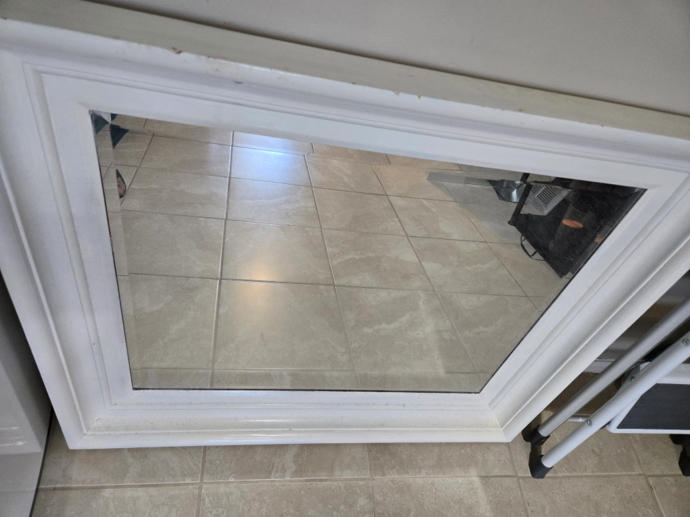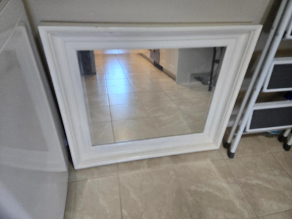 Selling a lovely white framed mirror! It's in great condition and would look great in any room. The size is perfect for adding a touch of elegance to your space. It's a simple yet stylish piece that will complement your decor