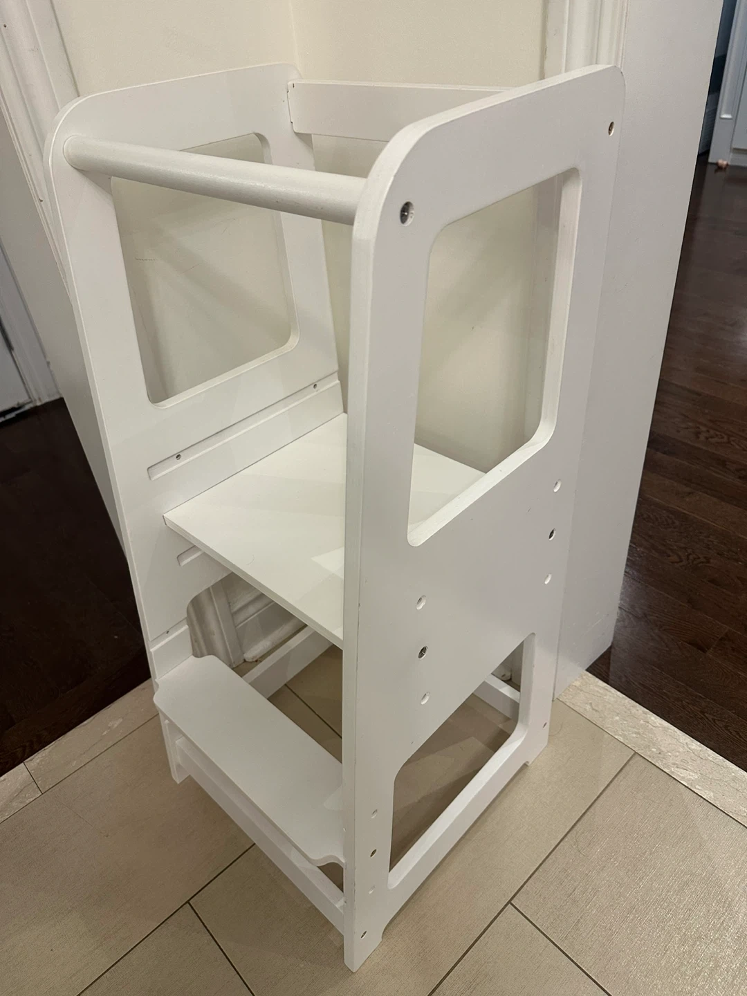 Selling a learning tower in great condition! It's perfect for toddlers who want to help out in the kitchen or reach higher places safely. It's a sturdy and reliable step stool that will help your little one explore the world around them