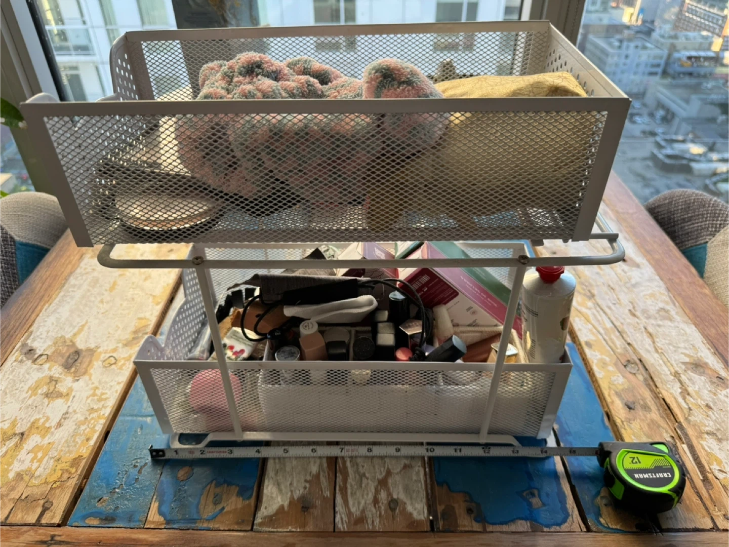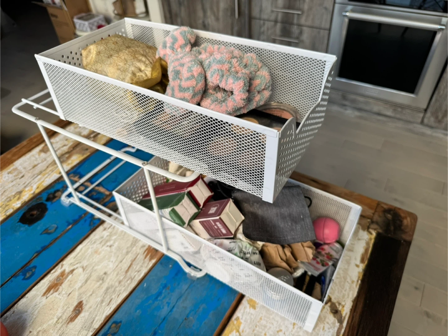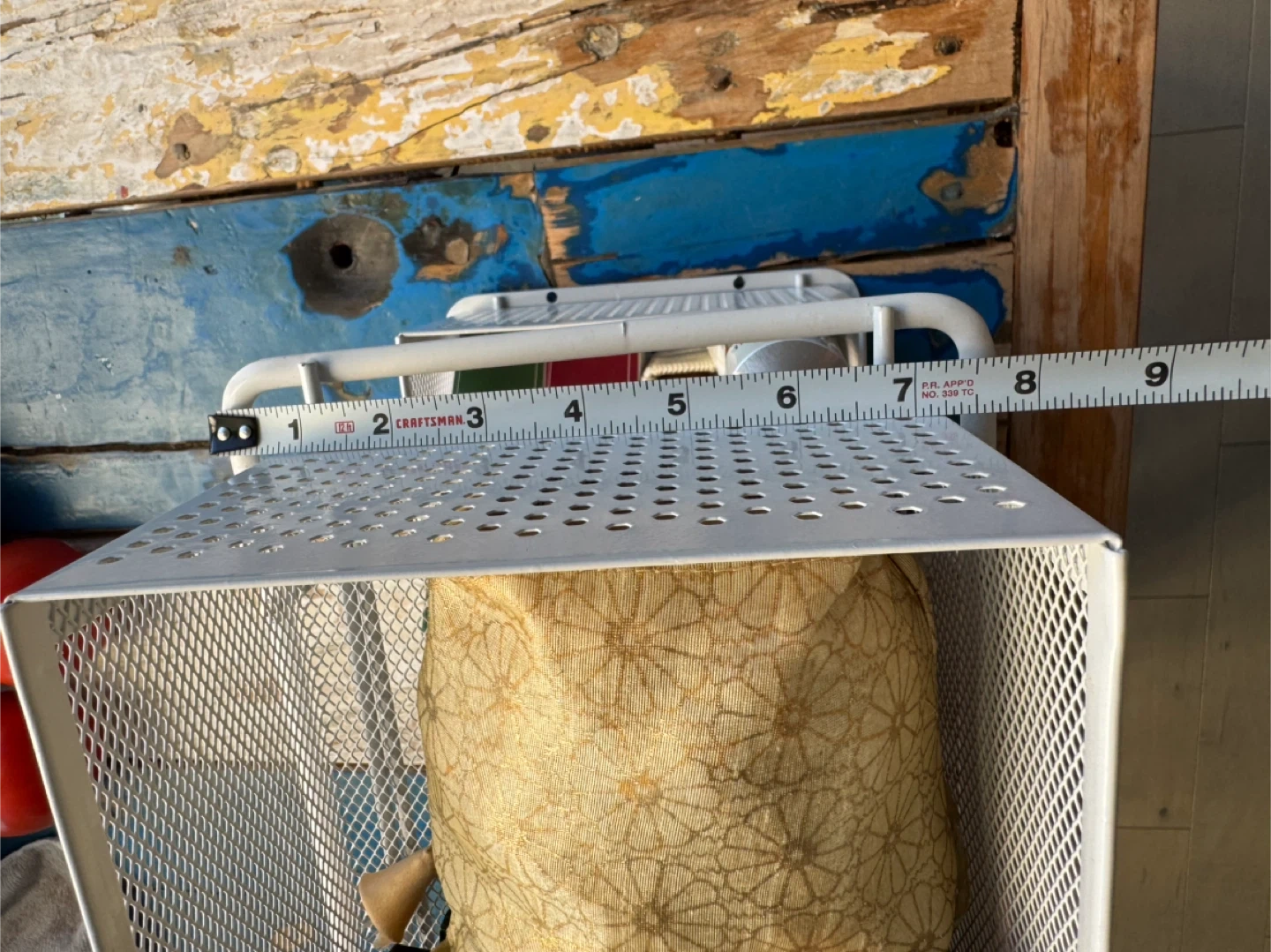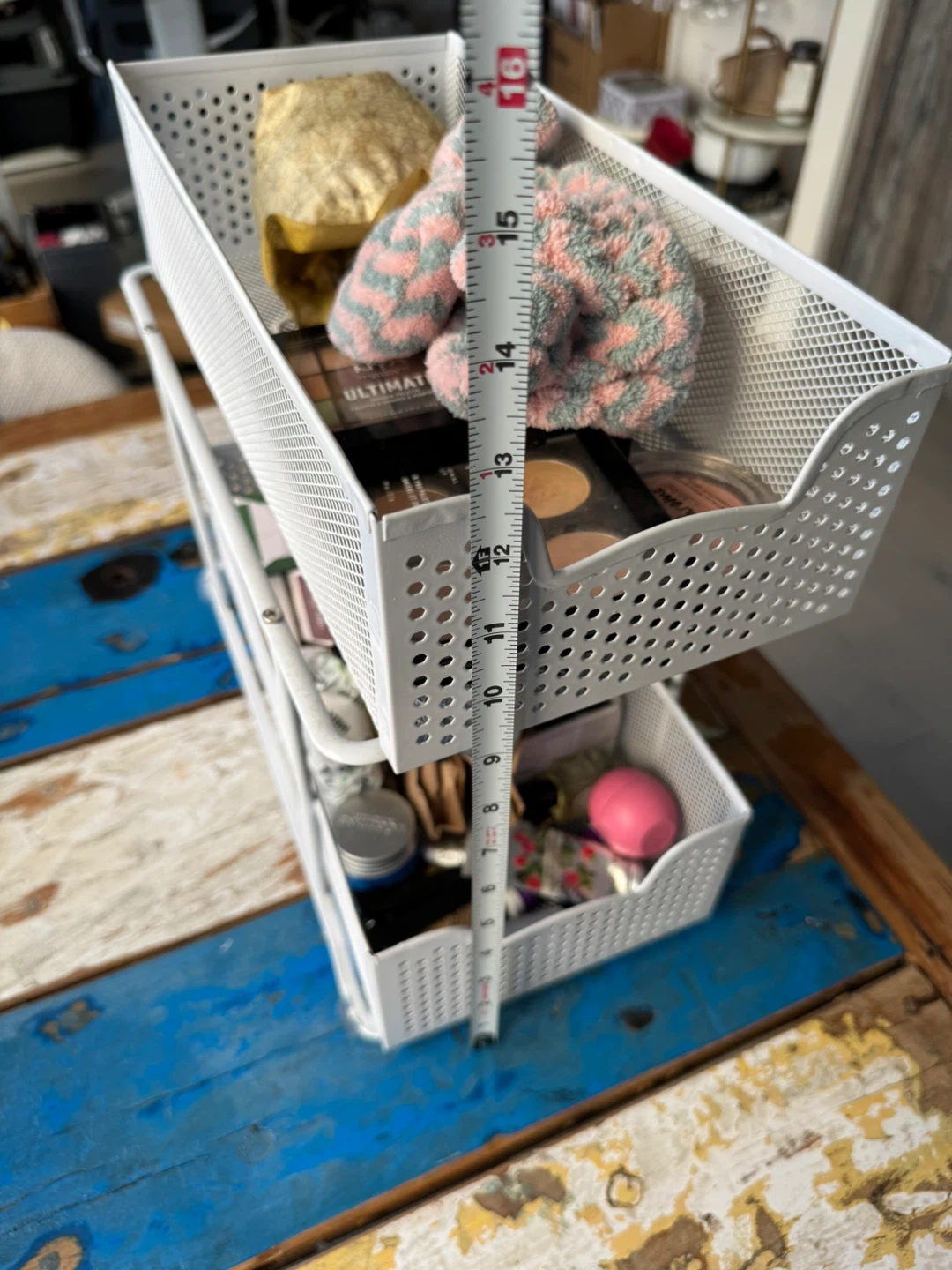 Two-tiered white metal mesh basket stand. Great for organizing various items around the house! The top basket is approximately 15 inches tall, and the top measures about 8 inches by 9 inches