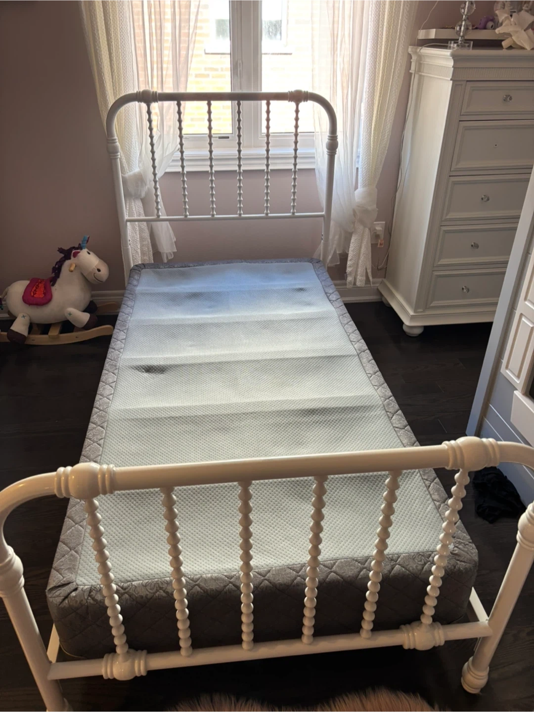 Selling a white metal twin bed frame. It's in good condition and ready for a new home! Perfect for transitioning your little one from a crib to a bed. The frame is sturdy and easy to assemble