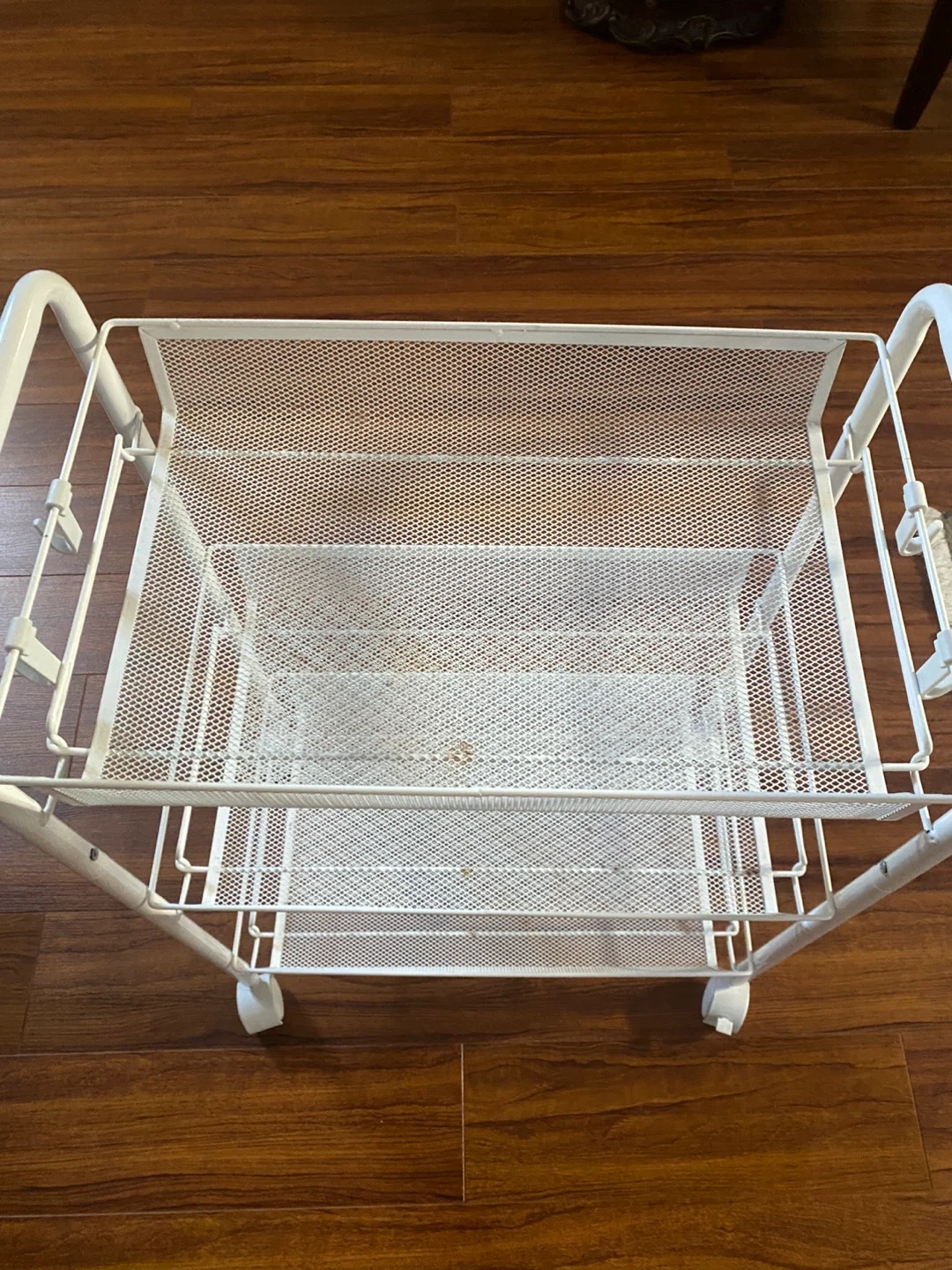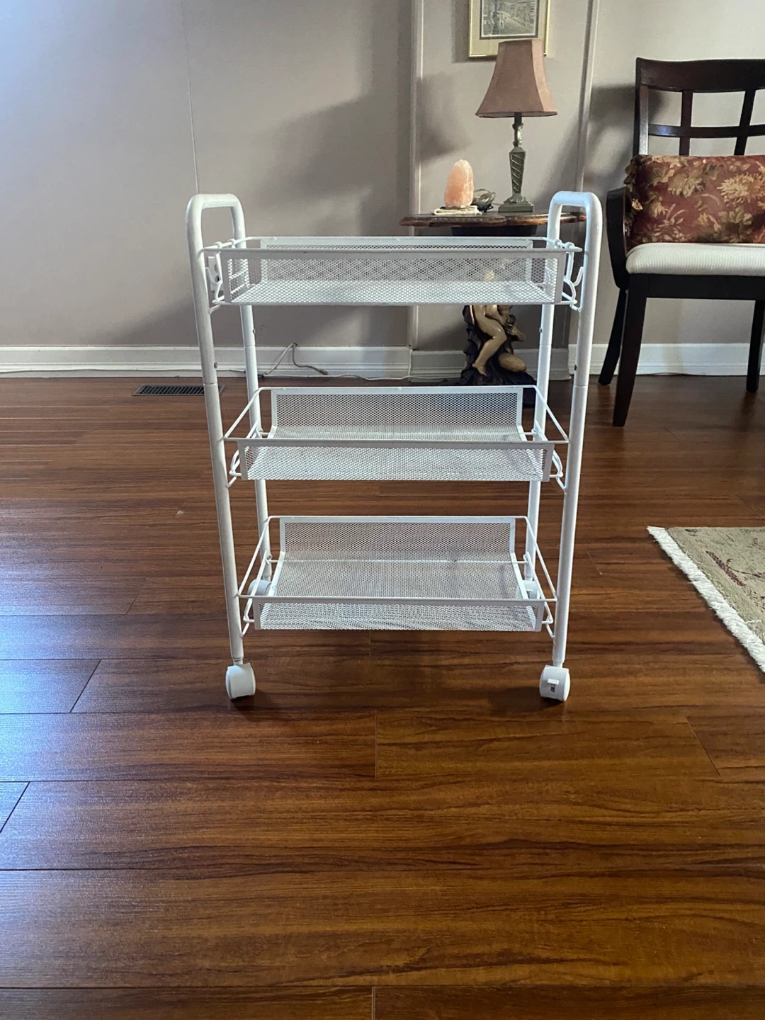 Here's a handy white rolling cart! It's perfect for adding some extra storage to any room. It's in great condition and ready for a new home