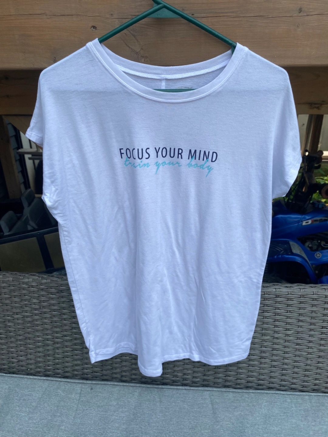 Open to negotiating prices. A simple, stretchy, and flowy white t-shirt with the words "Focus Your Mind" printed on the front. It's in great condition and ready for a new home
