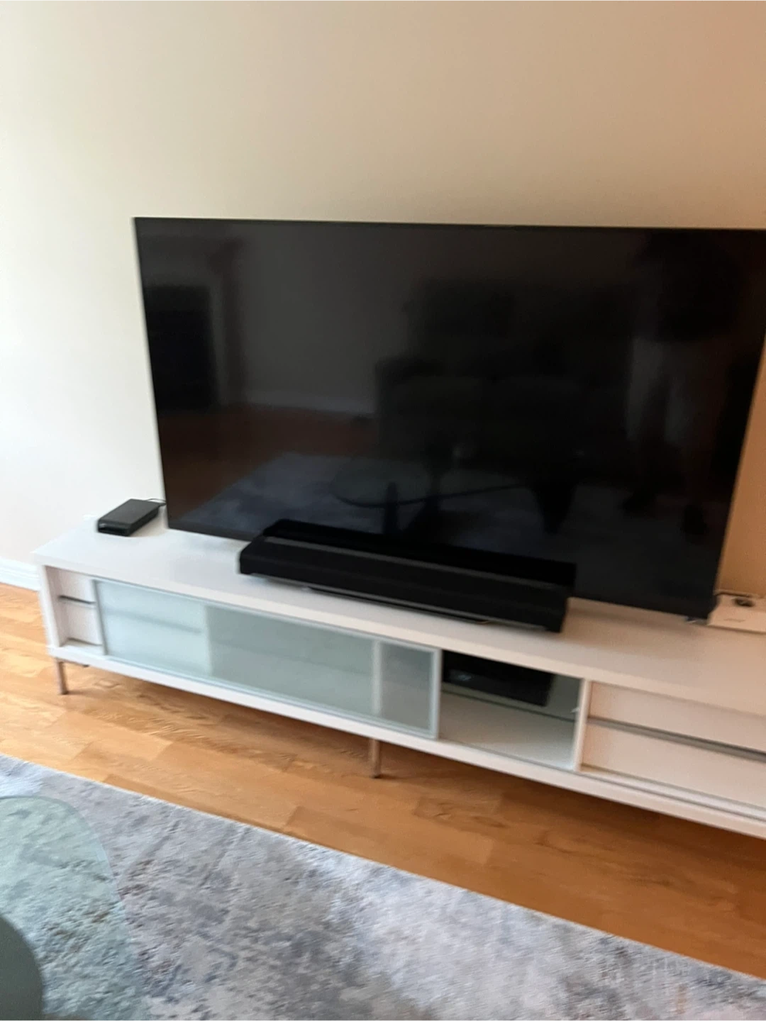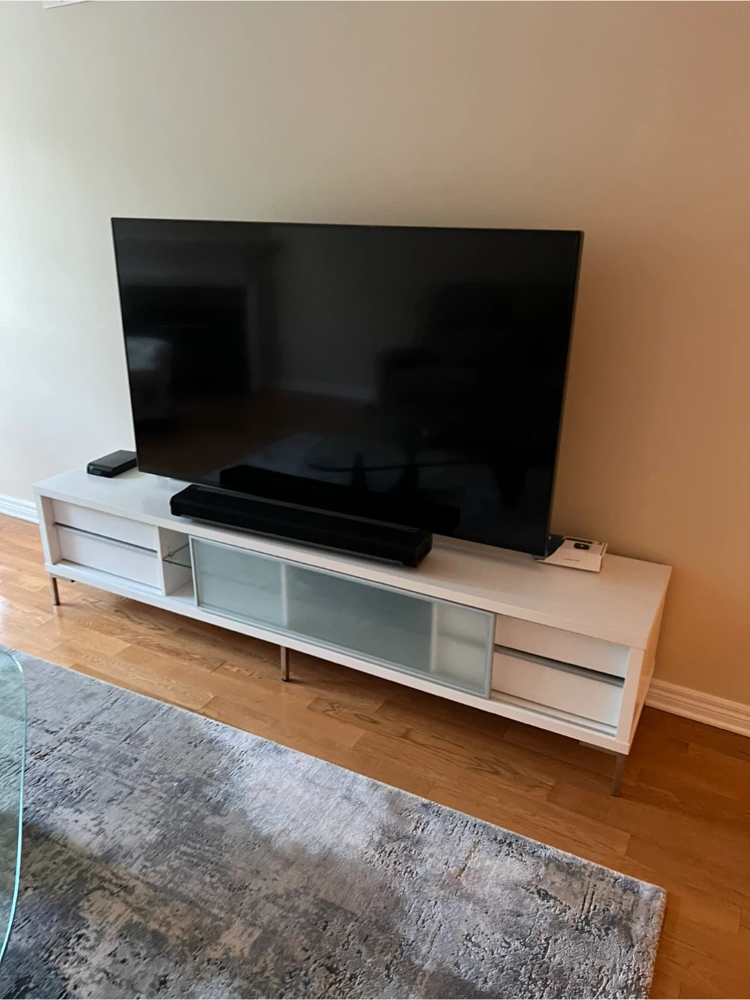 Looking to sell my TV stand! It's perfect for any living room setup. It has plenty of storage space with drawers and shelves for all your media devices and accessories. The white colour is neutral and will match any decor
