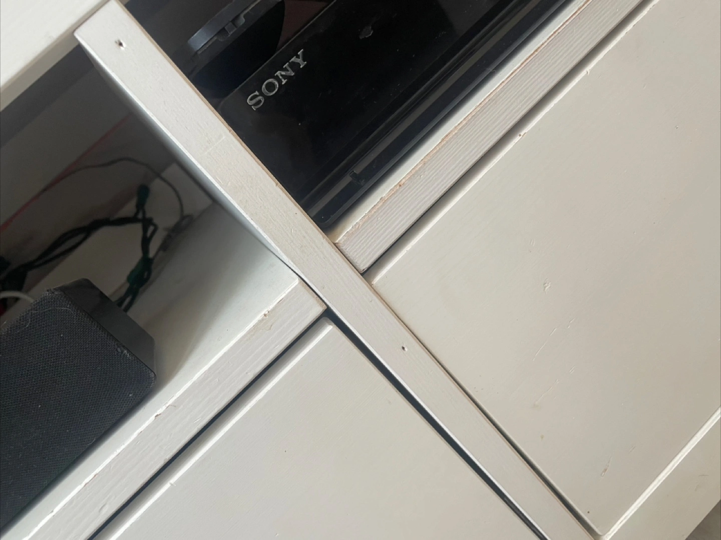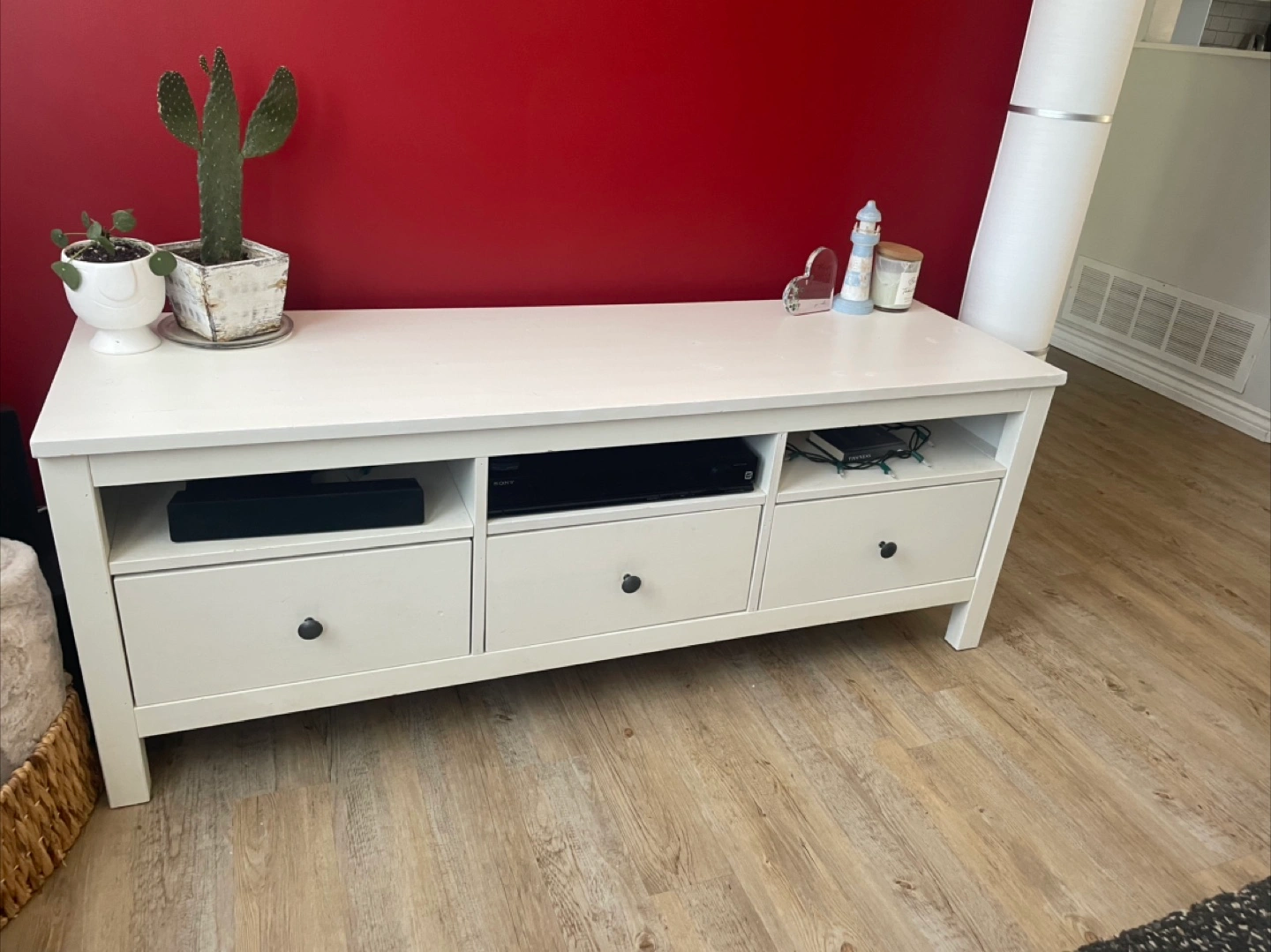 I'm selling a white TV stand with drawers. There are some signs of wear on the top surface, as well as nail marks on the front, as shown in the photos. Originally $349 +tax **Pick up only**