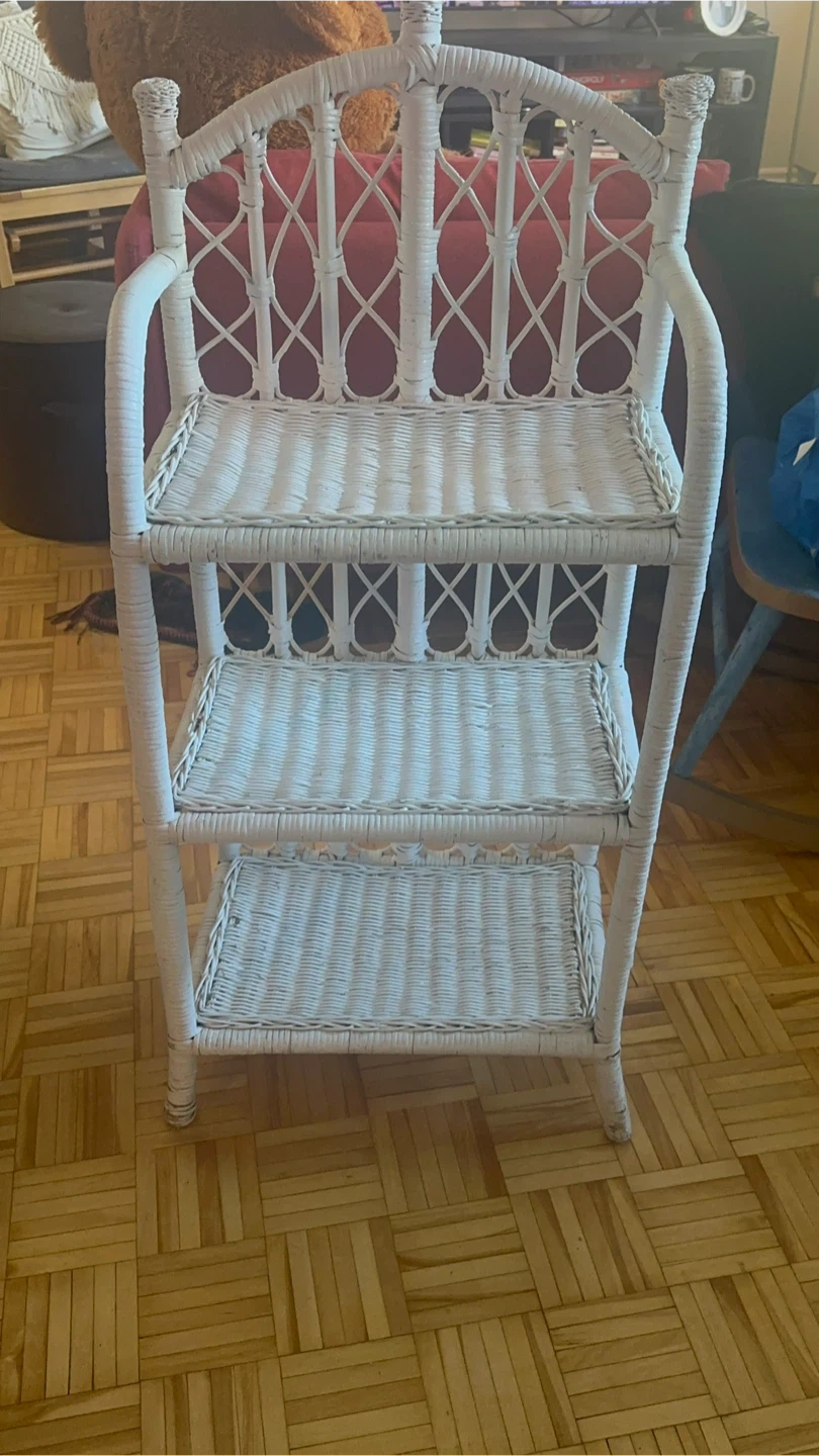 Here’s a charming white wicker shelf unit, perfect for adding a touch of cottagecore to any room! It features three tiers, offering ample space for displaying your favourite books, plants, or decorative items. The wicker construction adds a lovely texture and a light, airy feel to your space