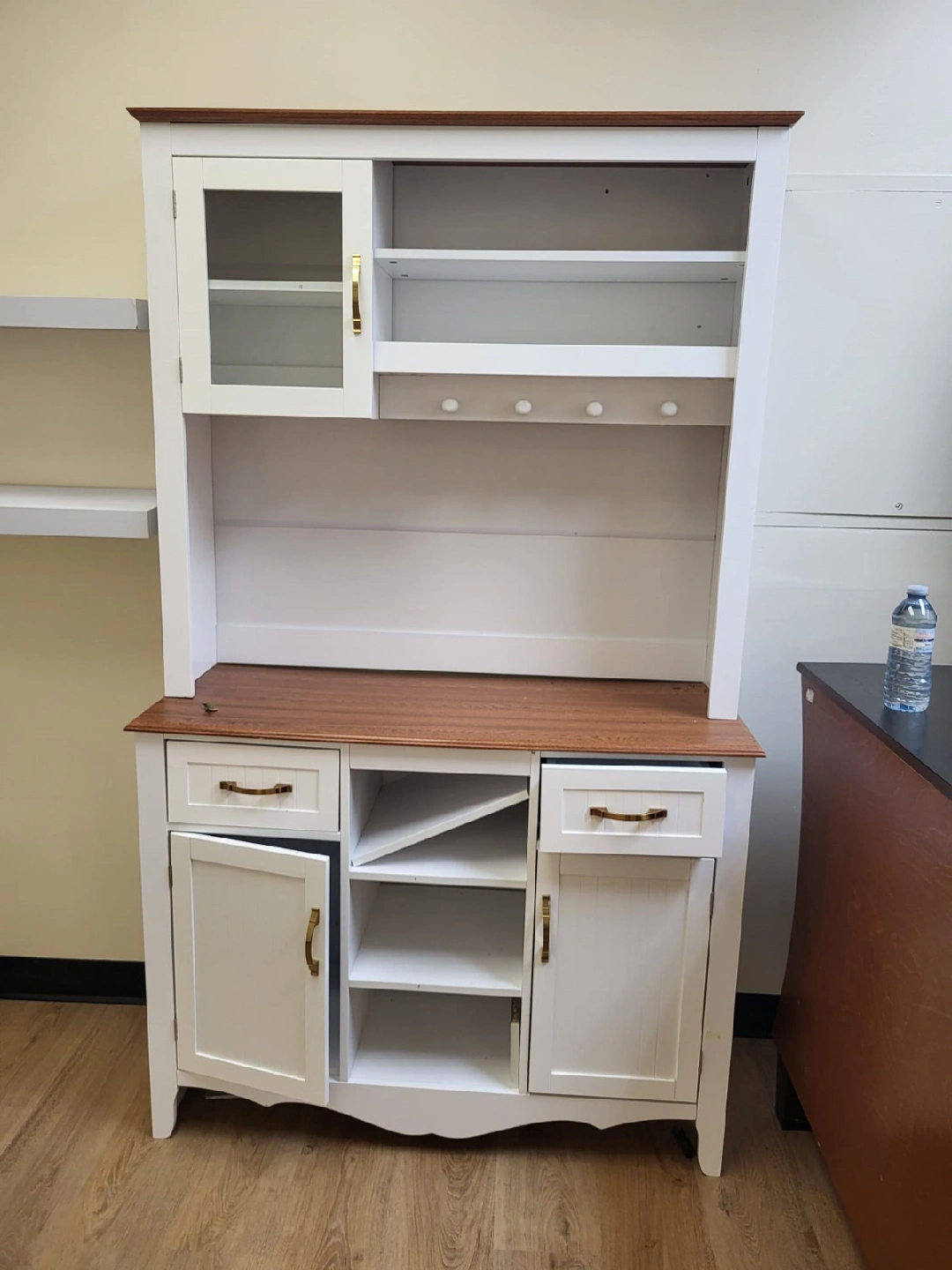 Selling a lovely hutch! It features a white painted finish with a contrasting wood top and trim. Lots of storage space with shelves, drawers, and cabinets. Perfect for a dining room or kitchen! pickup in east york.