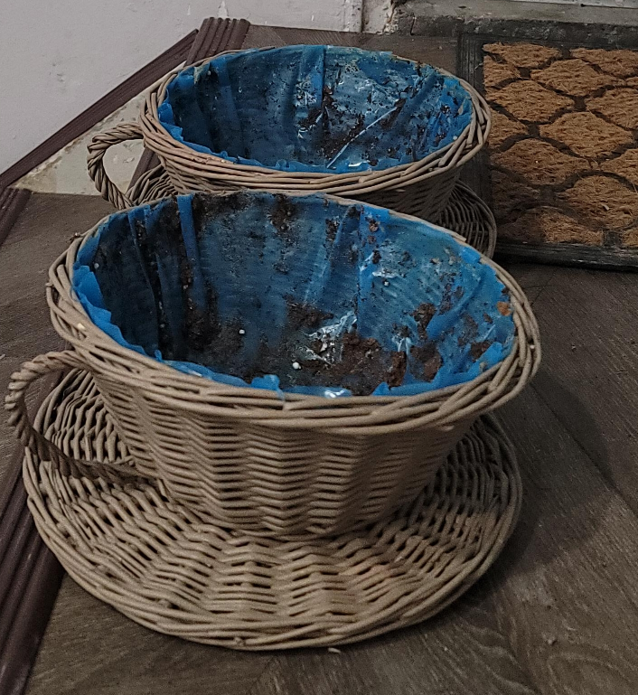 Selling a set of two adorable wicker planters shaped like teacups! They add a whimsical touch to any garden or indoor space. They are in used condition.