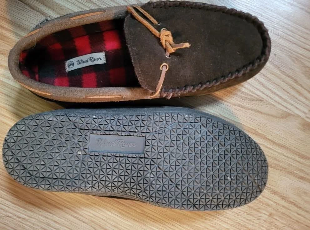 Cozy up with these Wind River moccasin slippers! They feature a classic design with a soft, comfortable interior and a durable sole for indoor and outdoor wear MENS WIND RIVER SUEDE SLIPPERS..SIZE 10...LIKE NEW(EXCEPT ONE LACE BROKE WHEN TYING THE FEW TIMES HE WORE)
