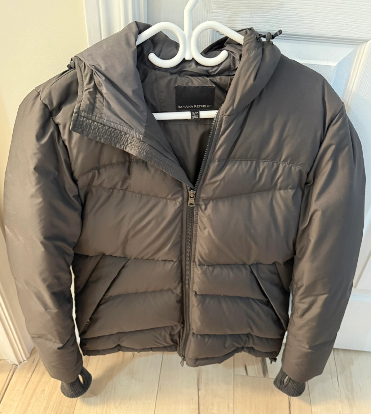Banana Republic 80% down filled winter jacket. Polyester shell. Grey color. Has hood and cuffed thumb hole sleeves. Note this fits as a true small. Selling because too small on me now. I am a 40” chest now, so this jacket is ideal for someone less than 38”. Even a 38” may find this too snug. From a smoke free and pet free home. In excellent condition.