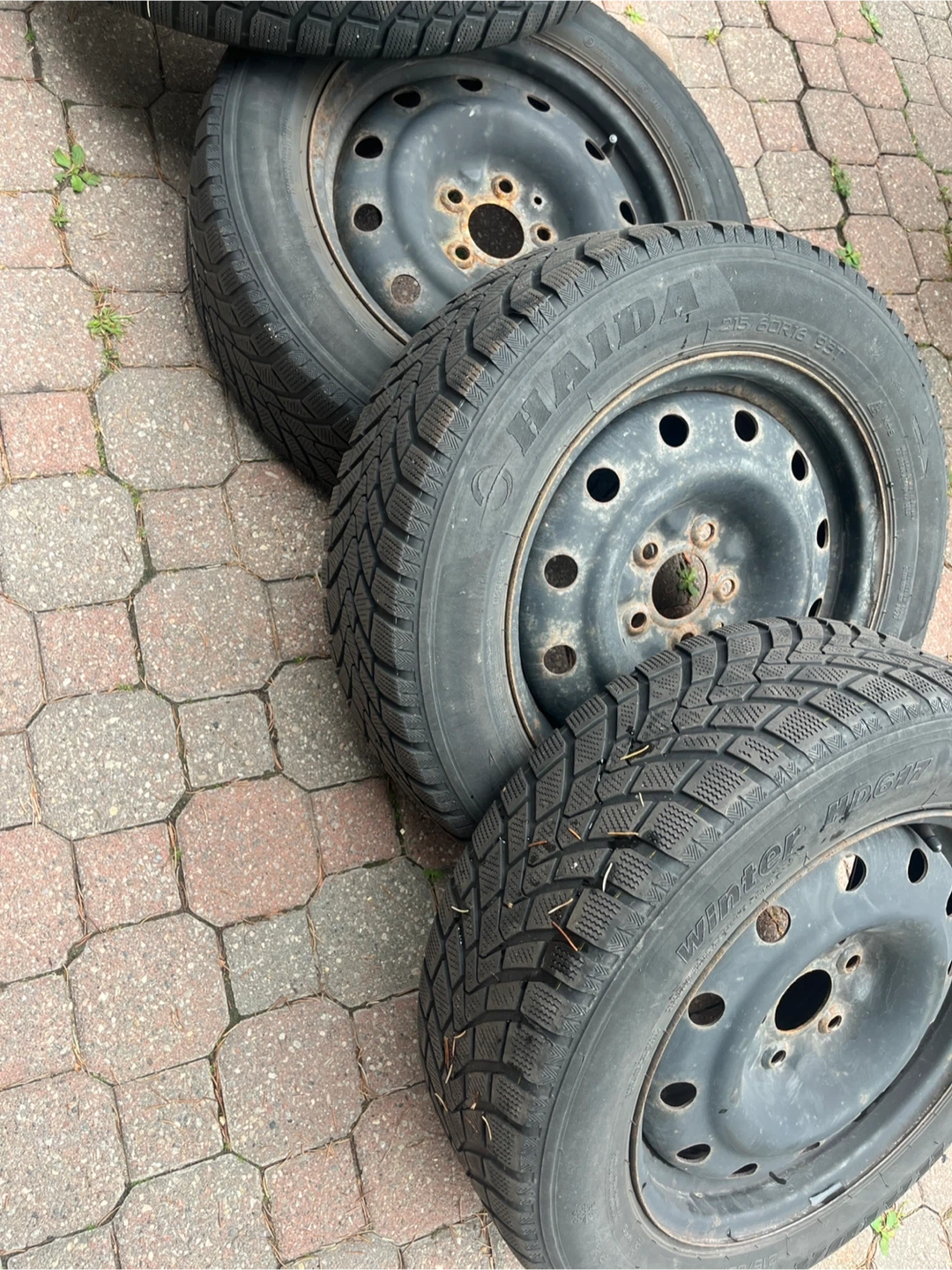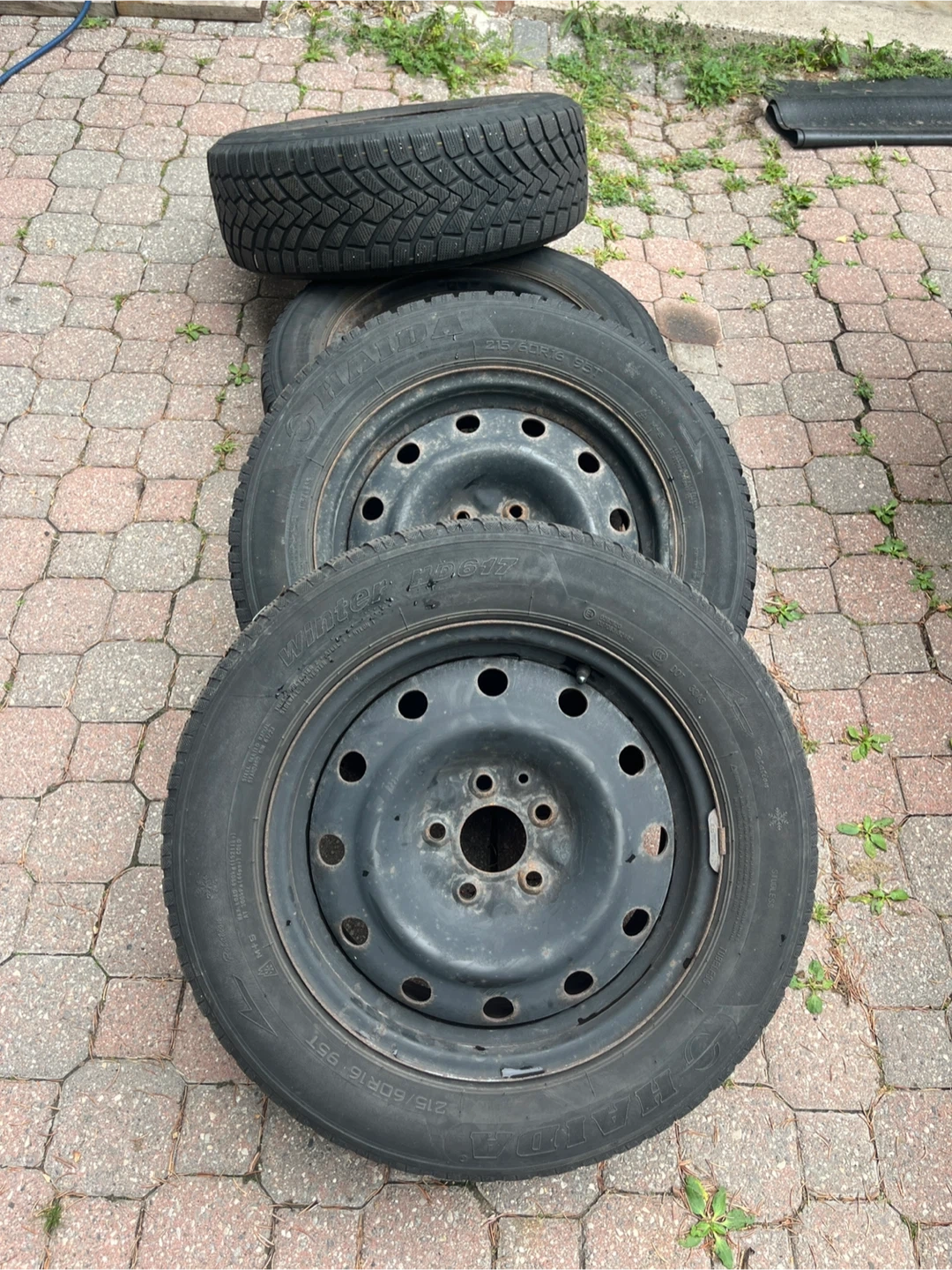 price is for all 4. winter tires 215/60R16. Still some life left in them. Rims are very good with 5x114.3 bolt patter 16 inch.