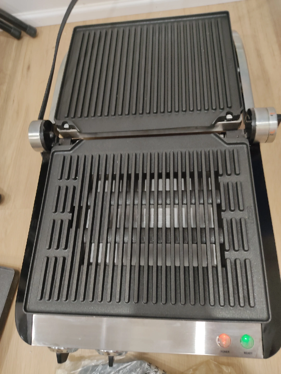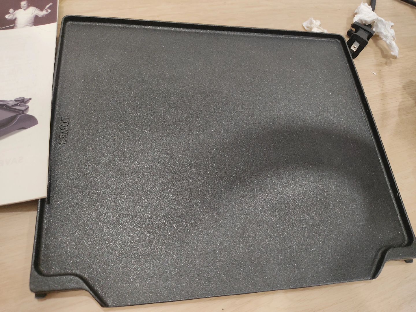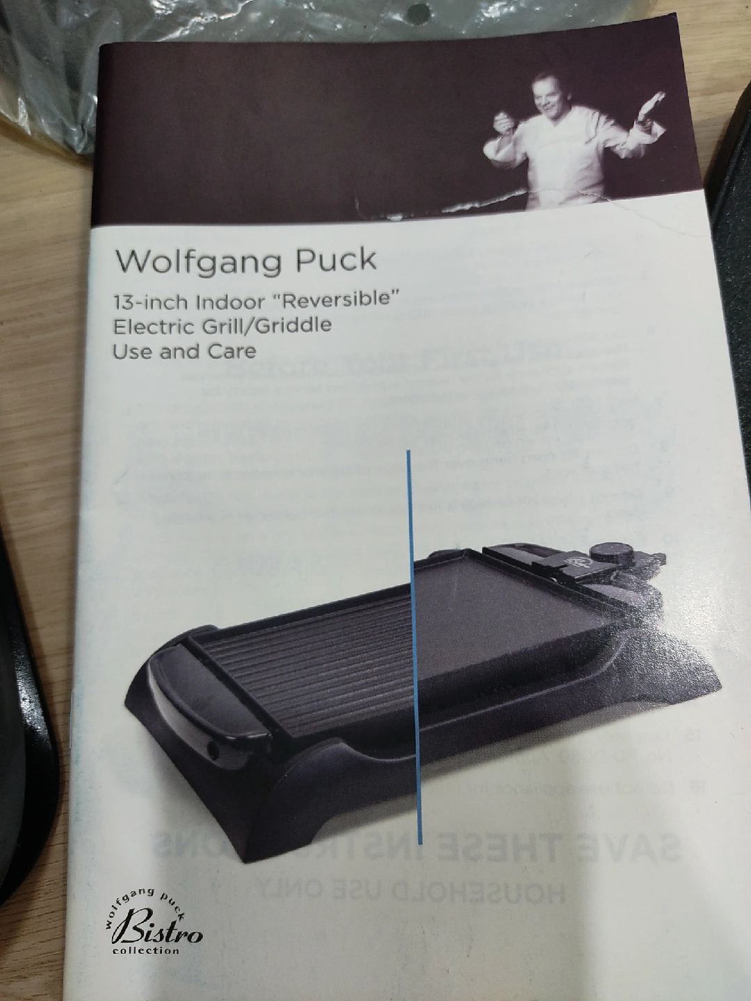 Selling a Wolfgang Puck 13-inch indoor electric grill and griddle. It's reversible and comes with a flat griddle plate. Includes the Use and Care manual